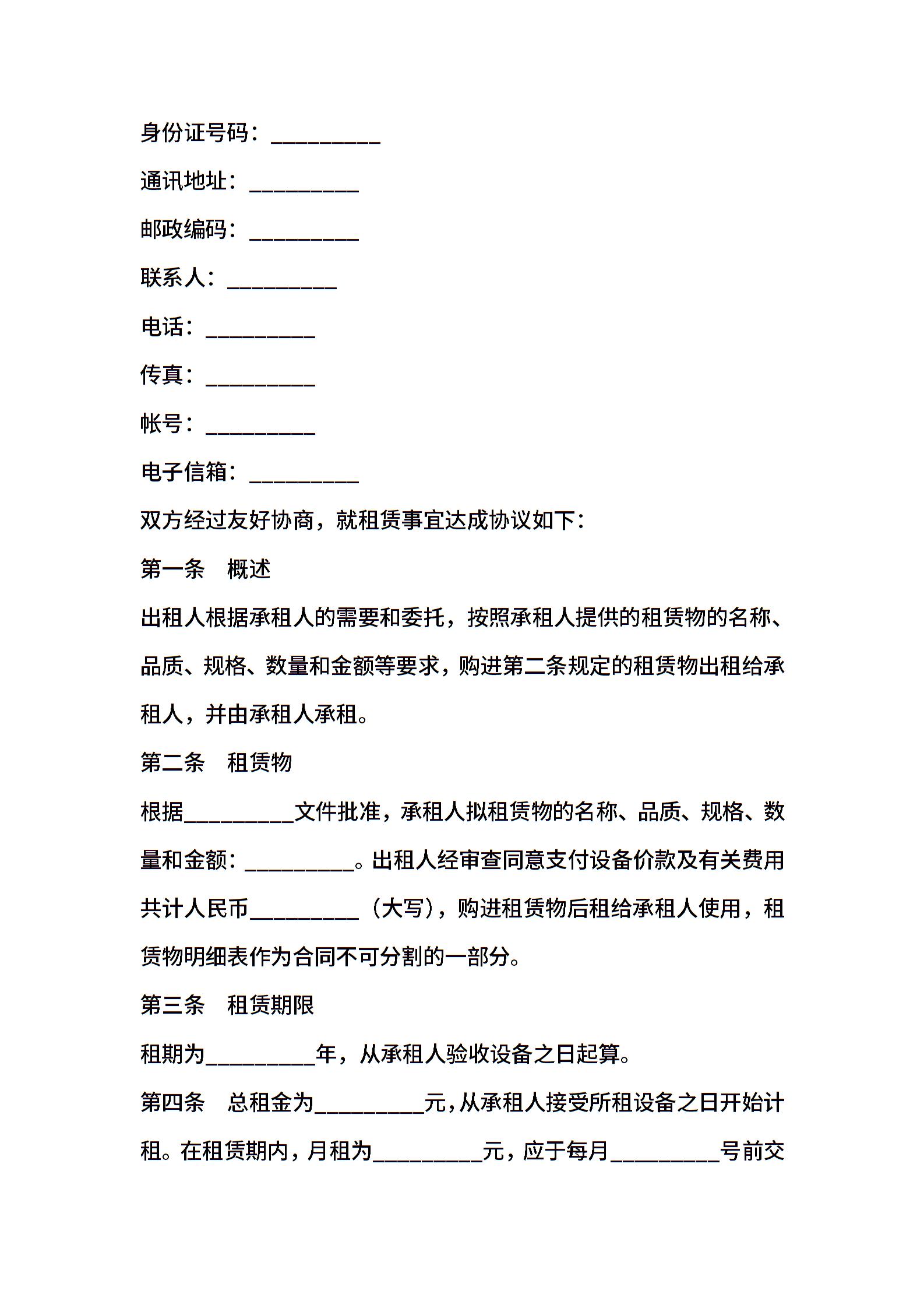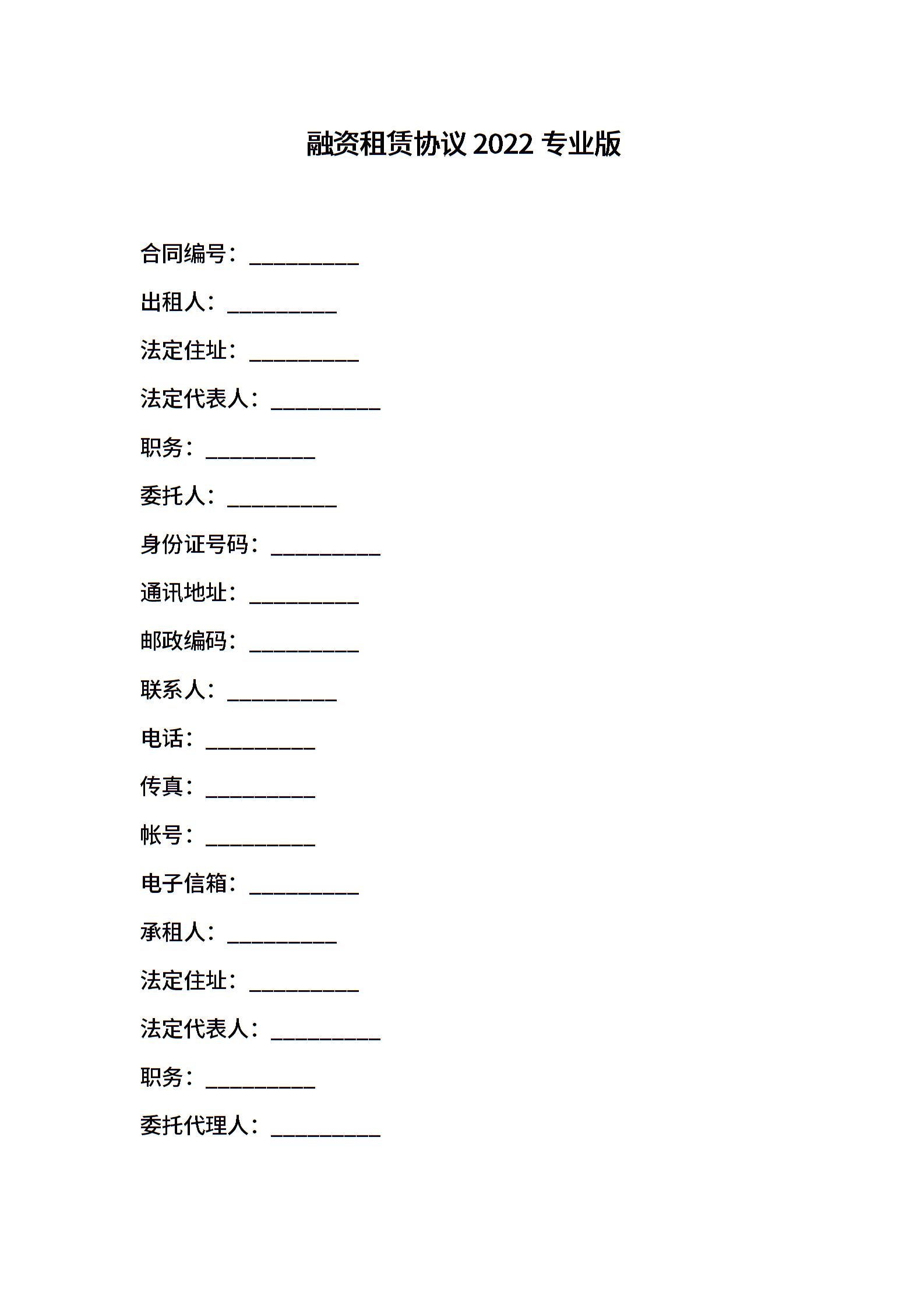 融资租赁协议2022专业版