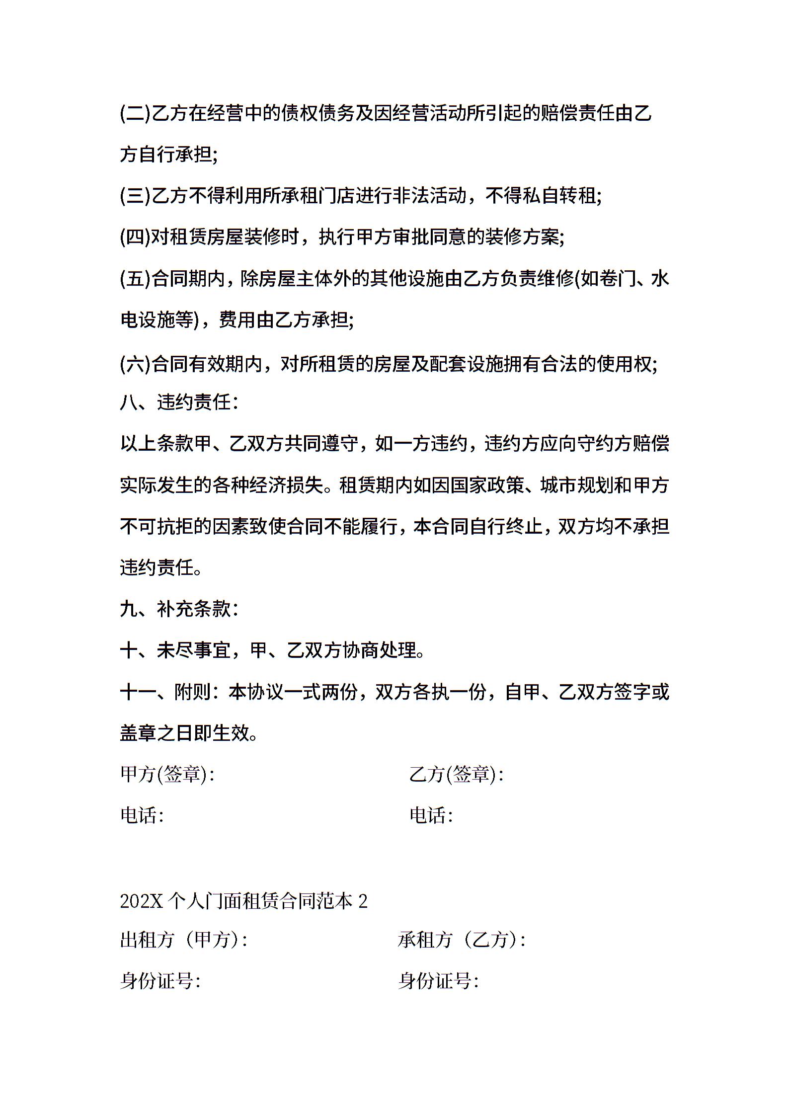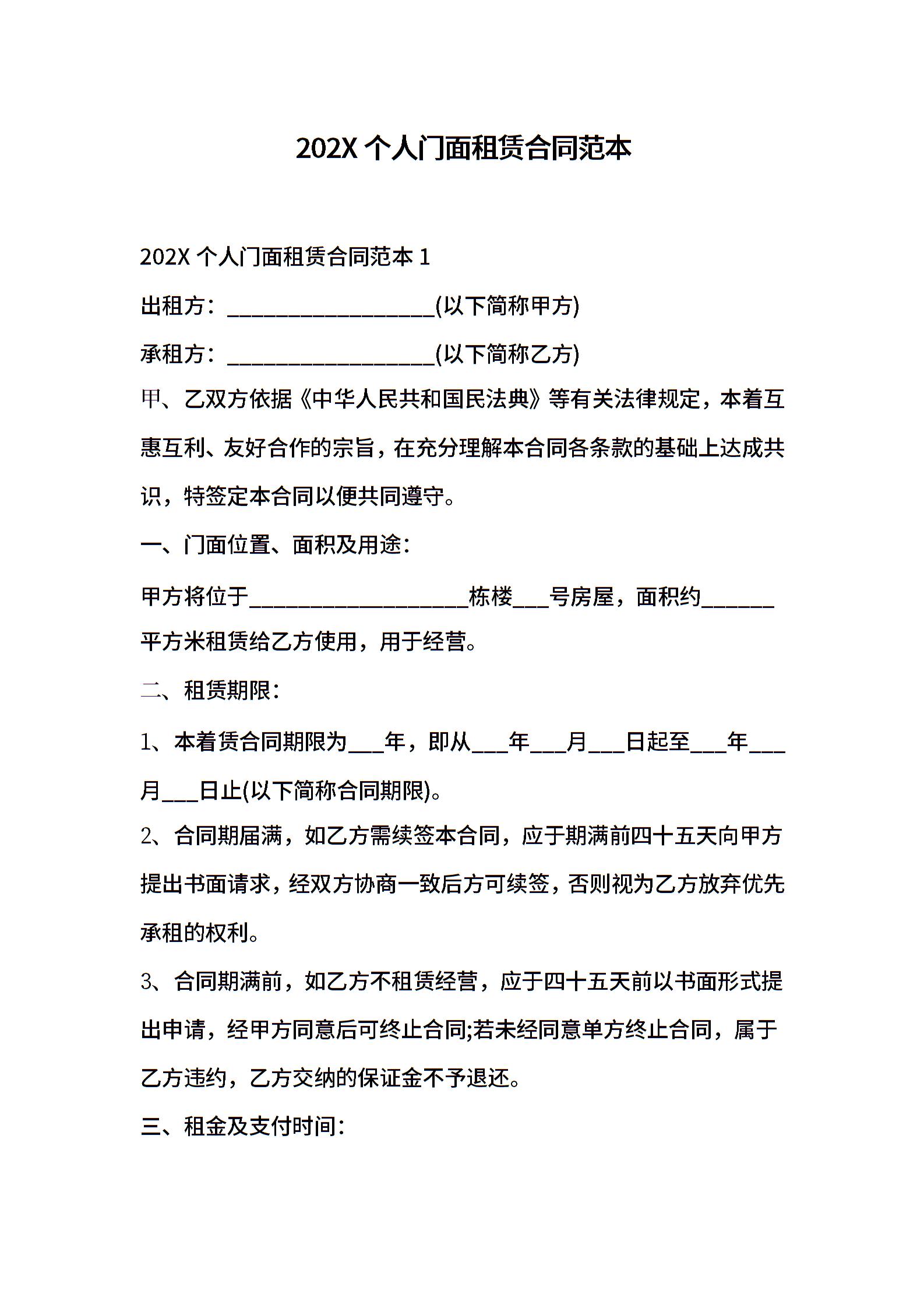 202X个人门面租赁合同范本
