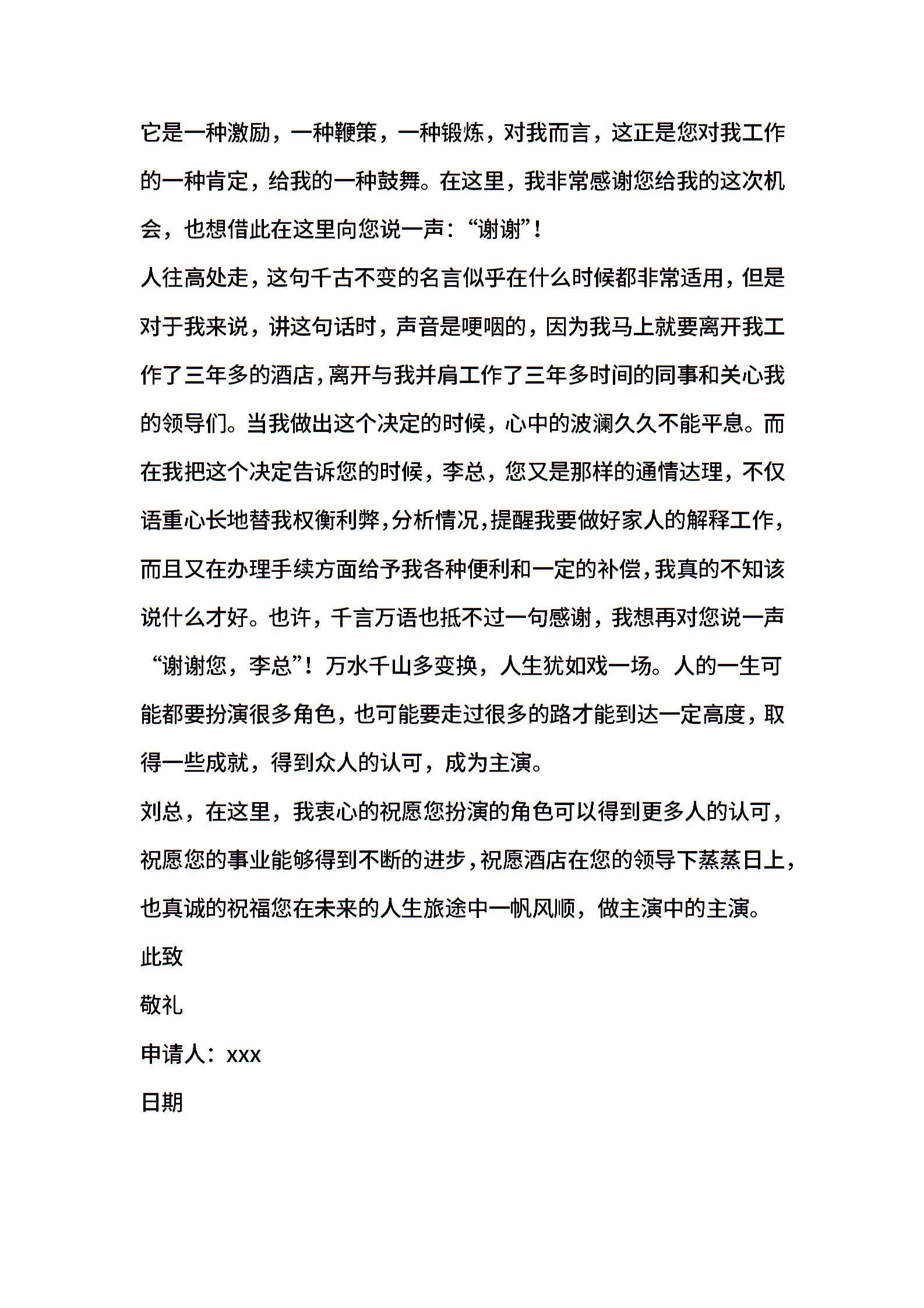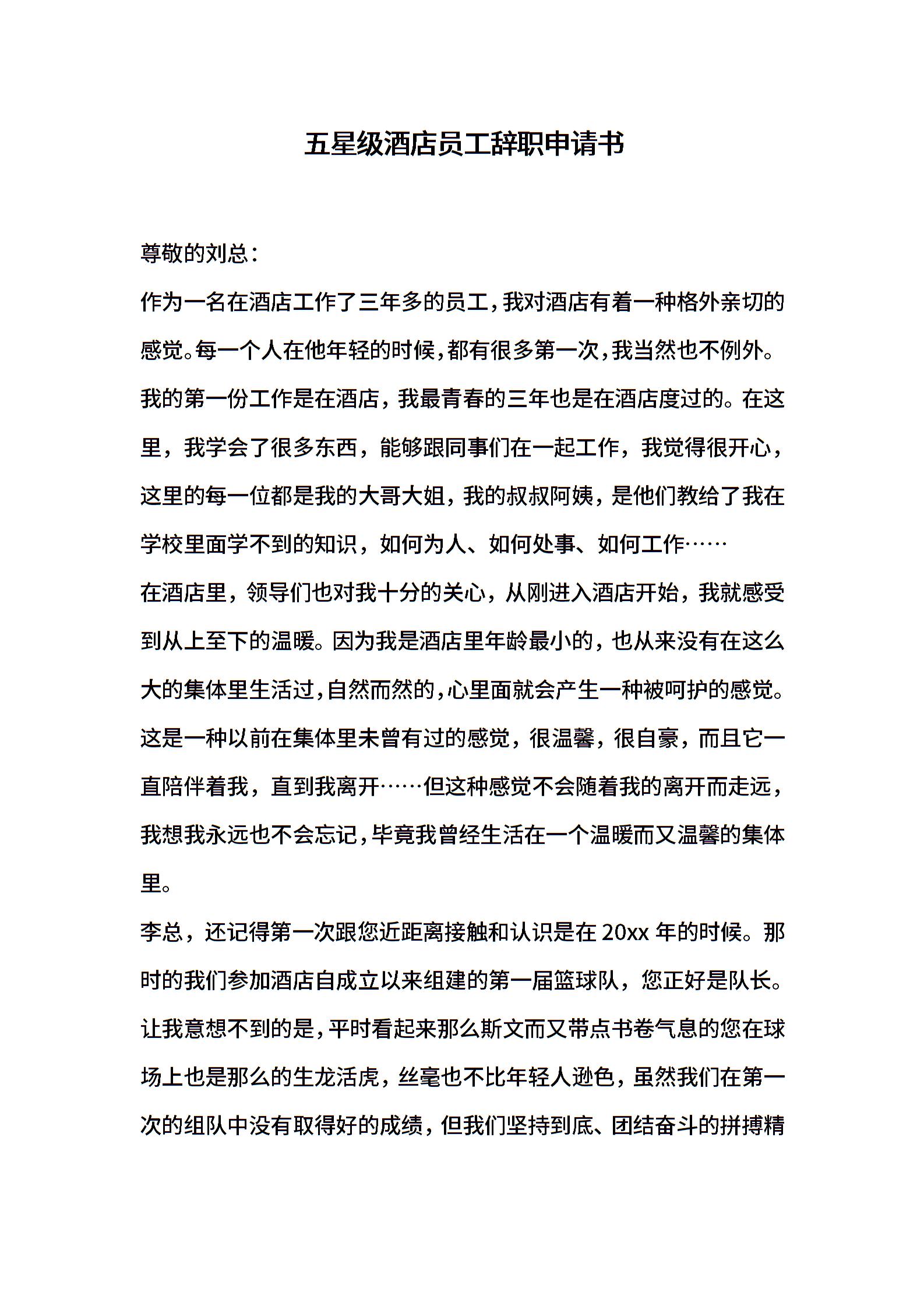 五星级酒店员工辞职申请书
