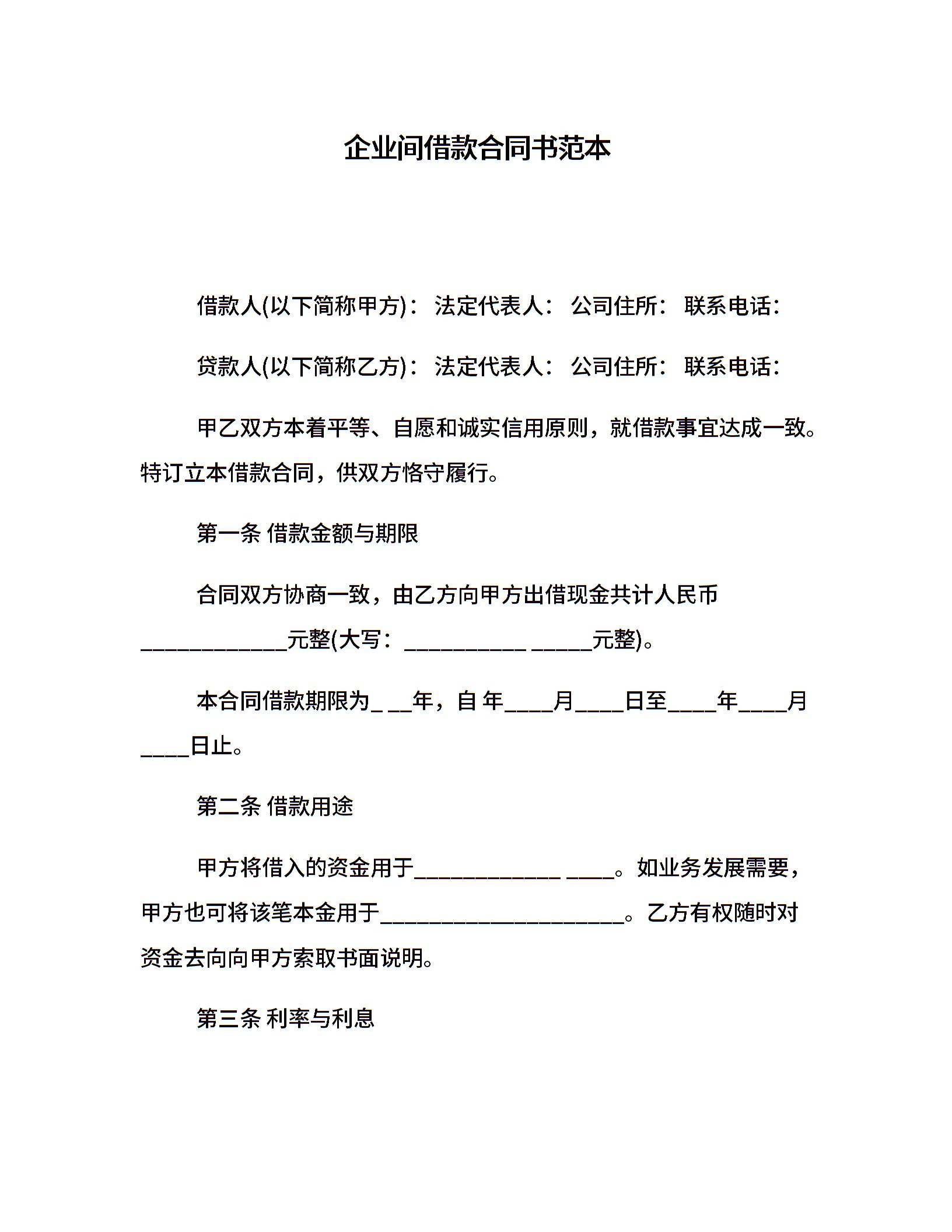 企业间借款合同书范本