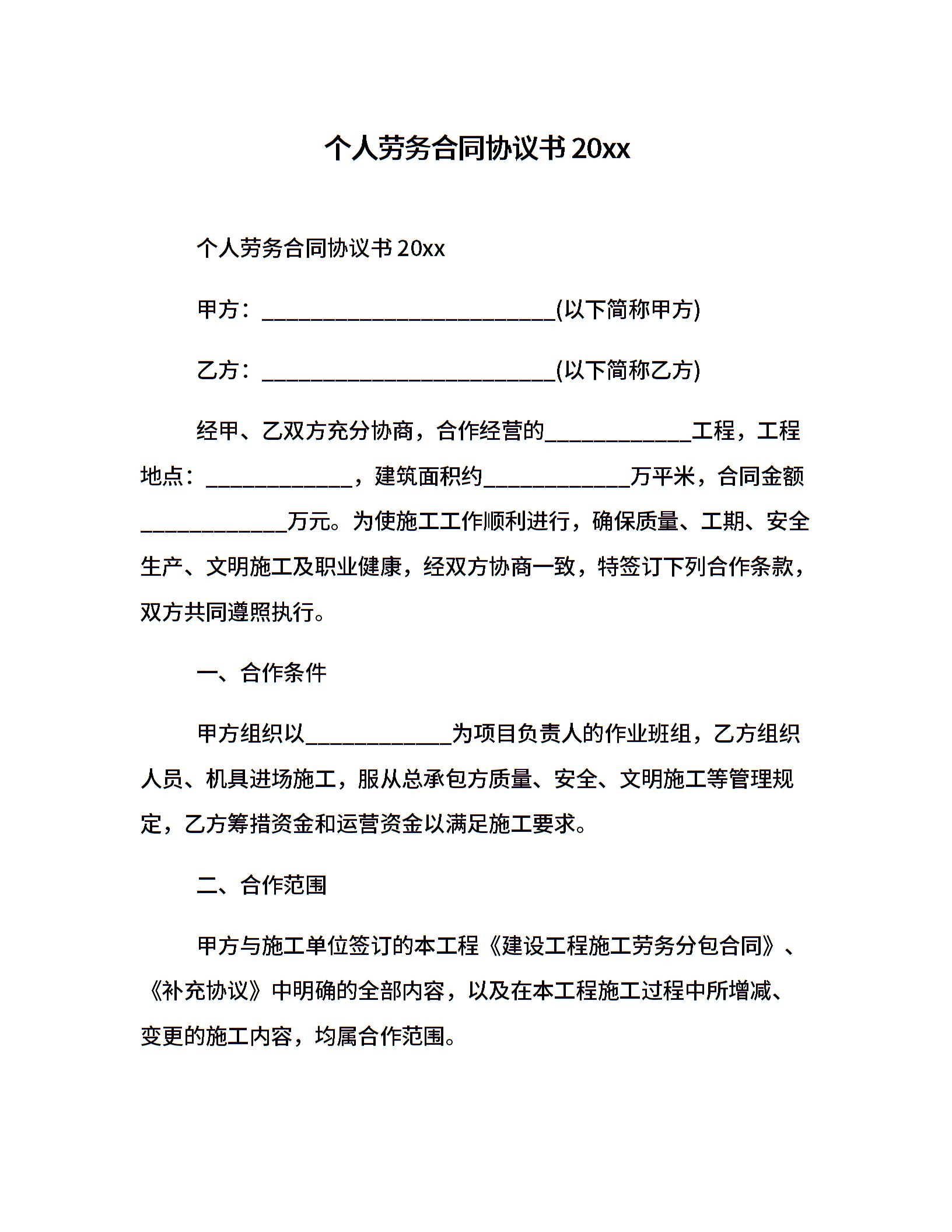个人劳务合同协议书20xx
