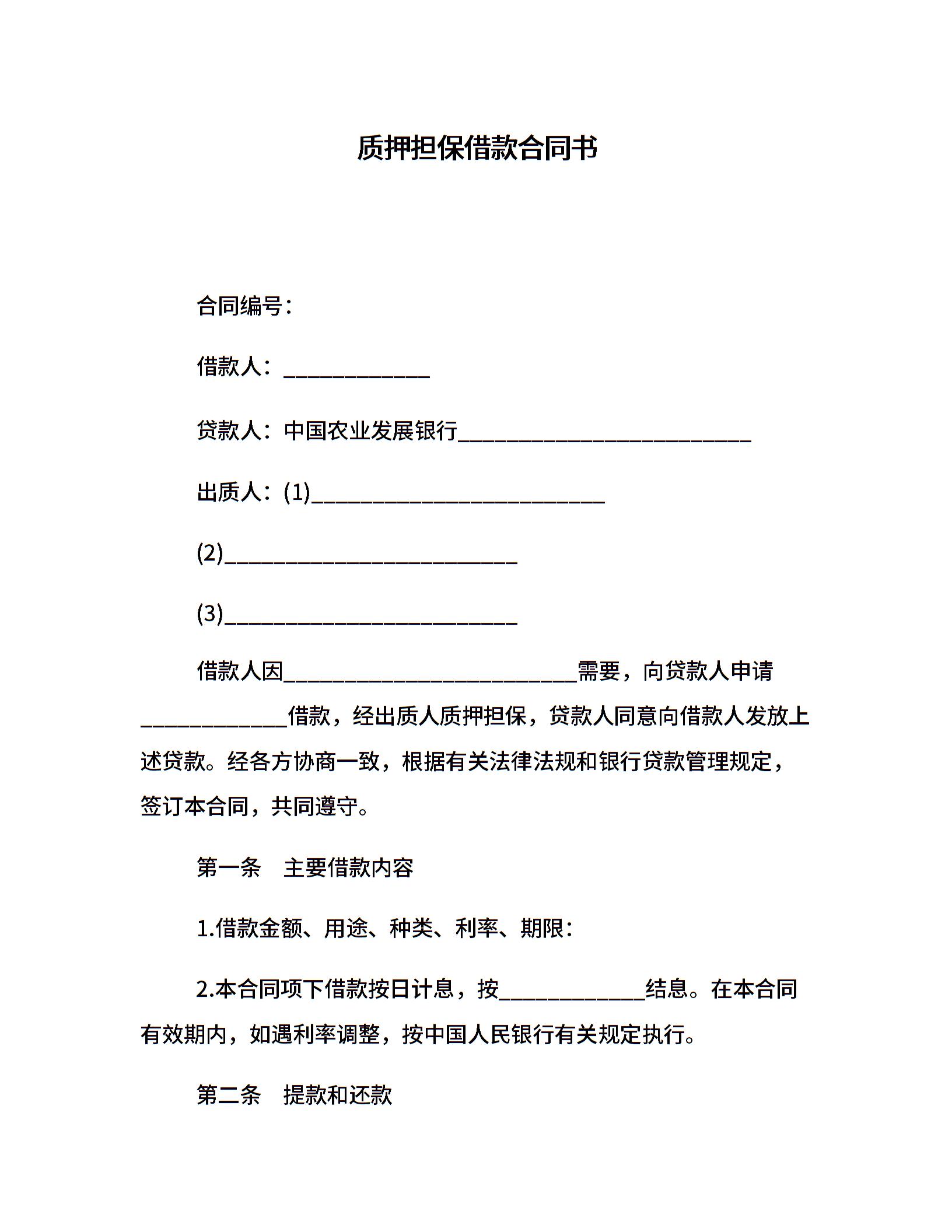 质押担保借款合同书