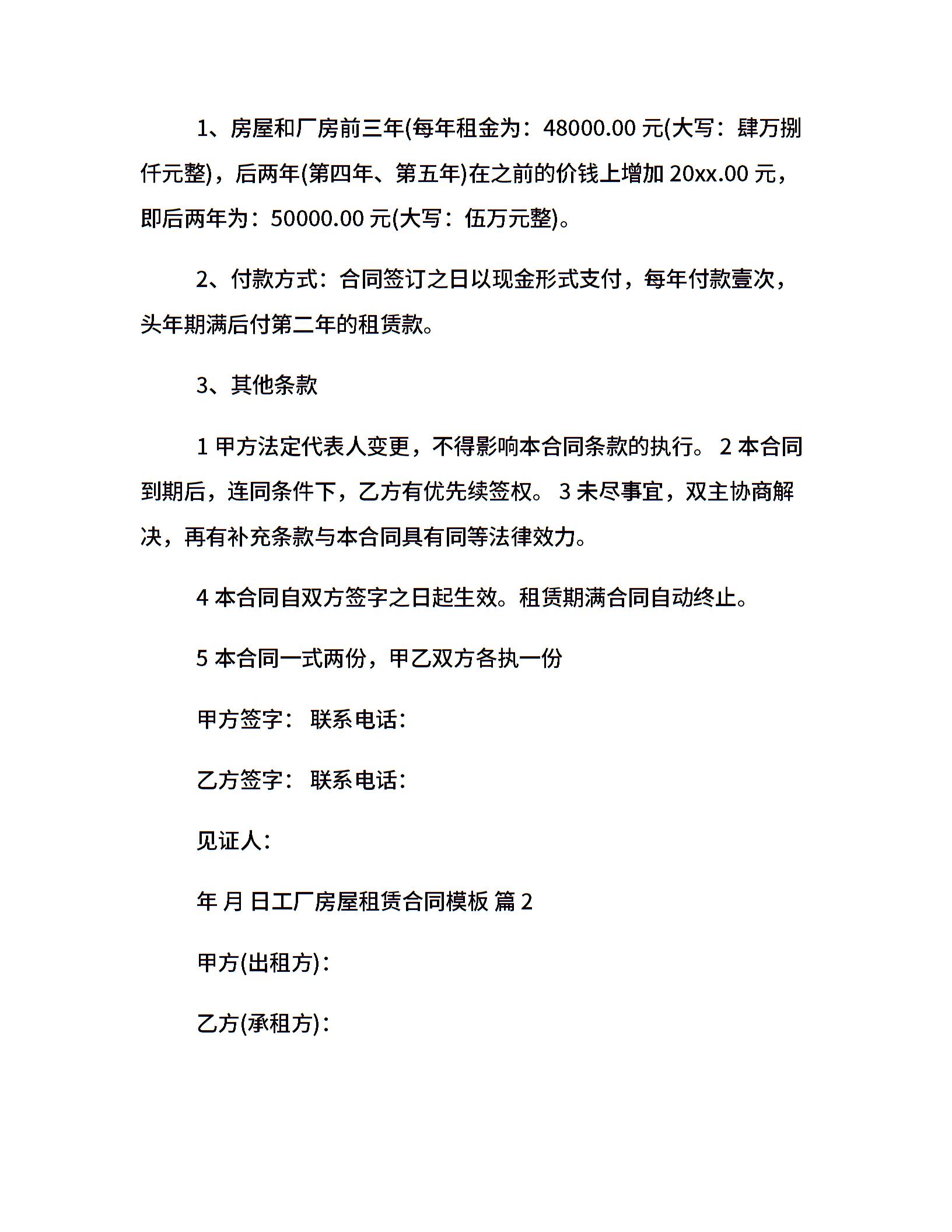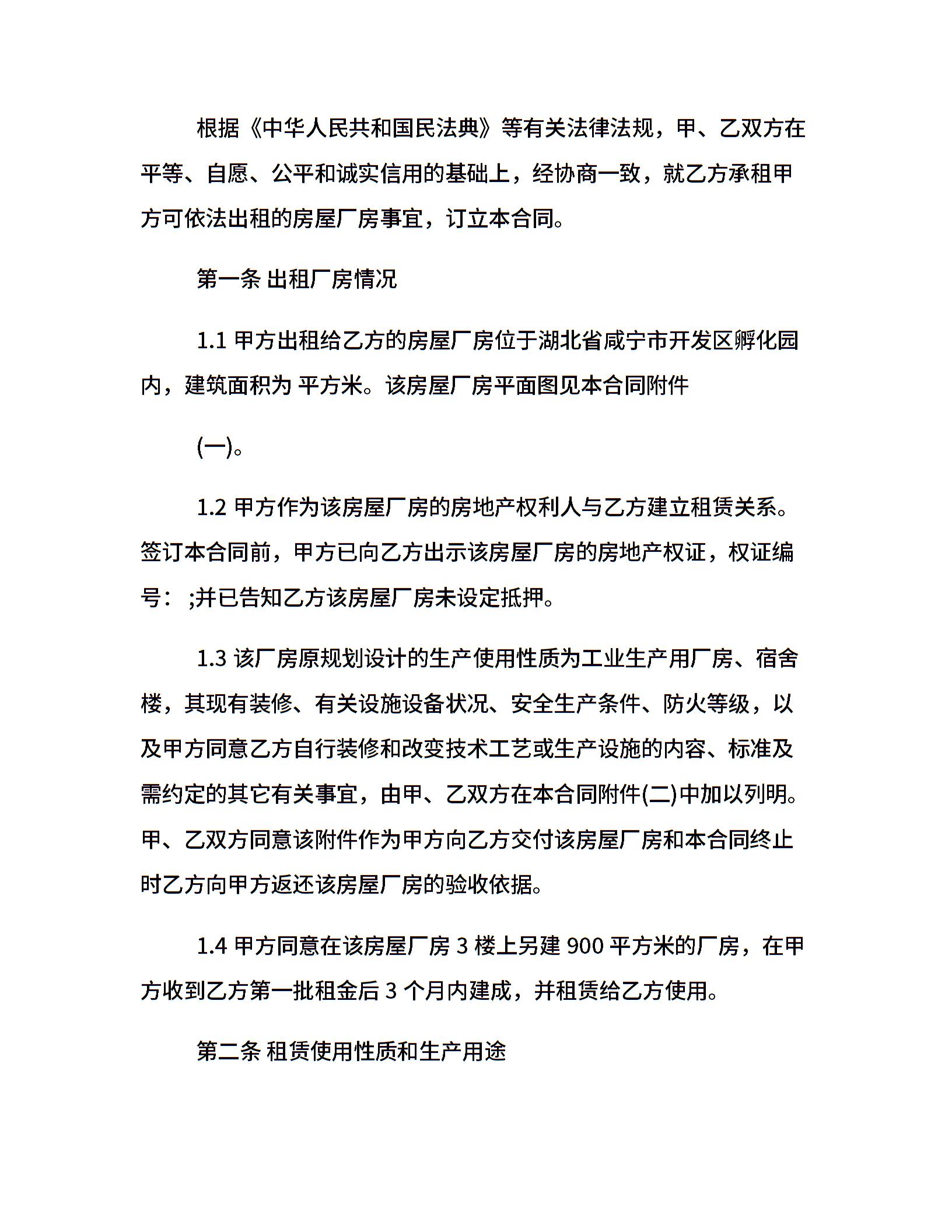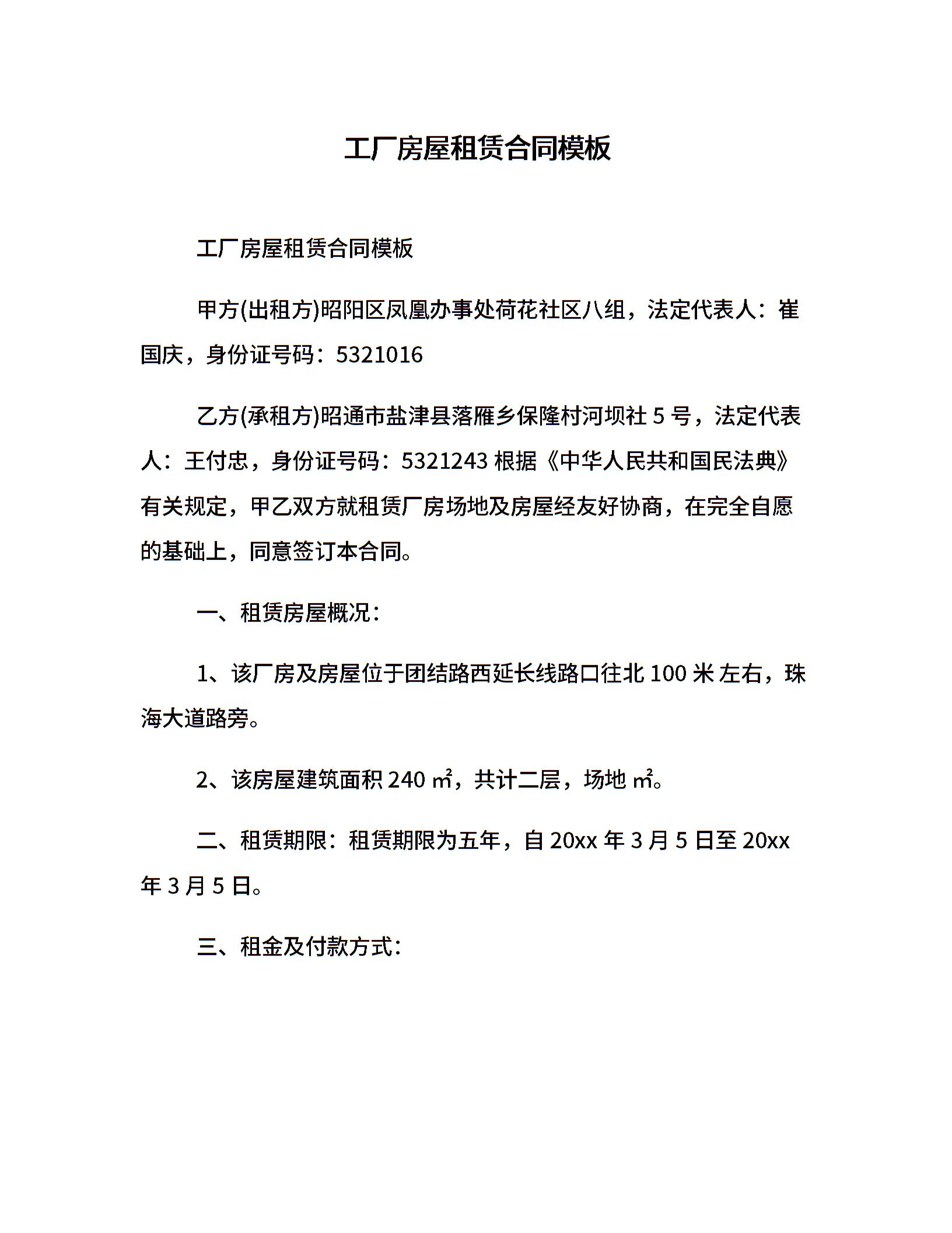 工厂房屋租赁合同模板