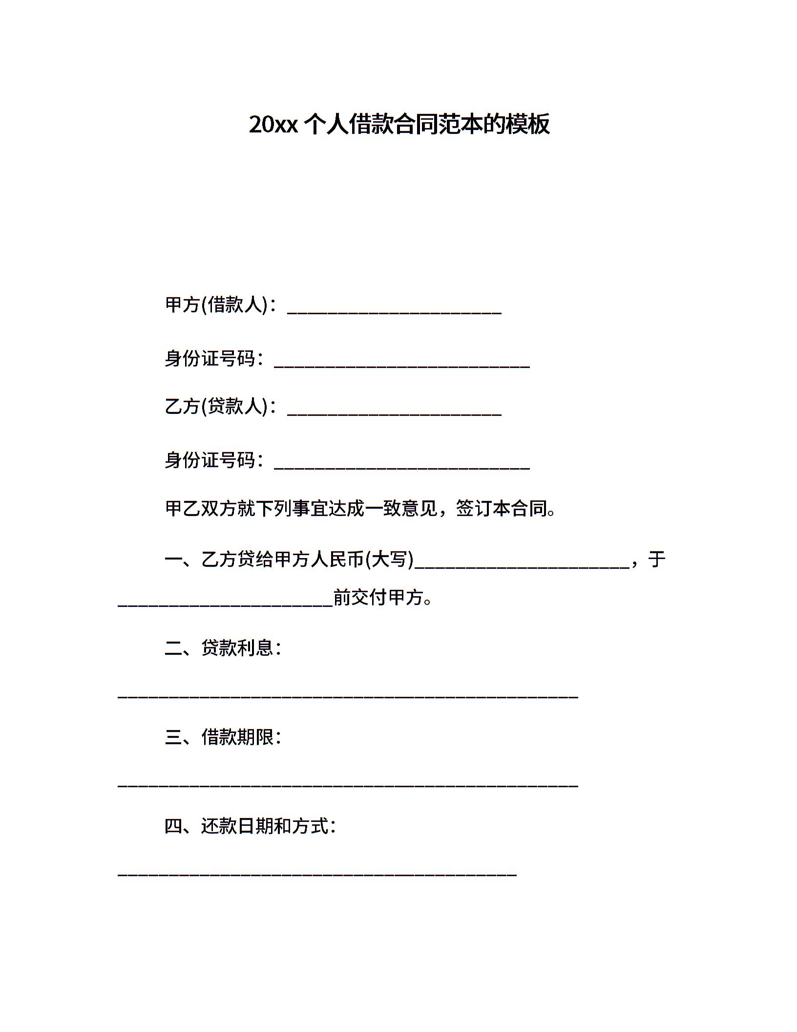 20xx个人借款合同范本的模板