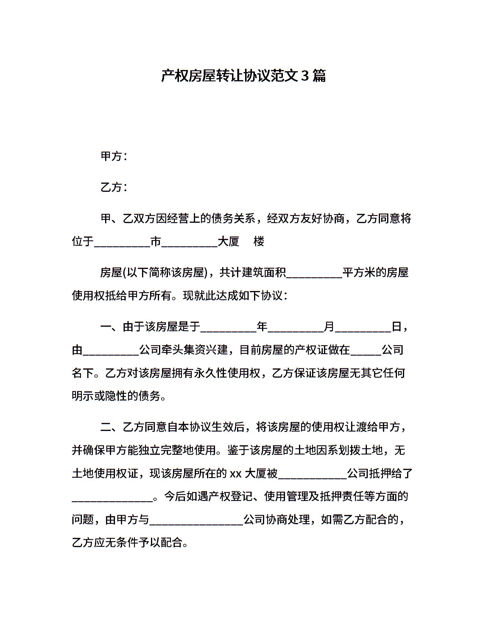 产权房屋转让协议范文3篇