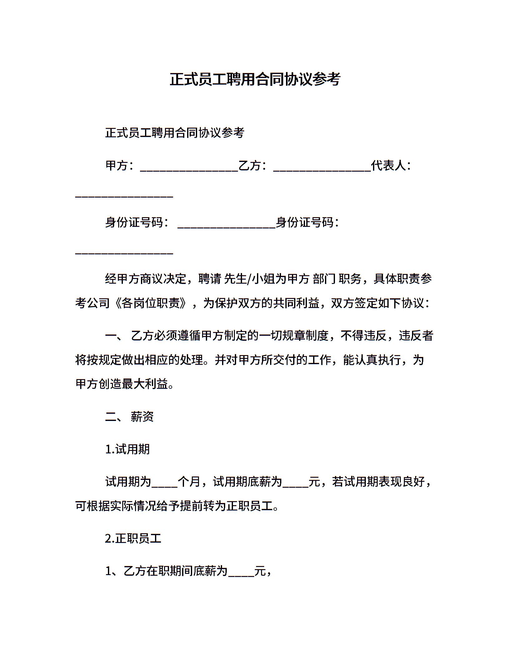 正式员工聘用合同协议参考