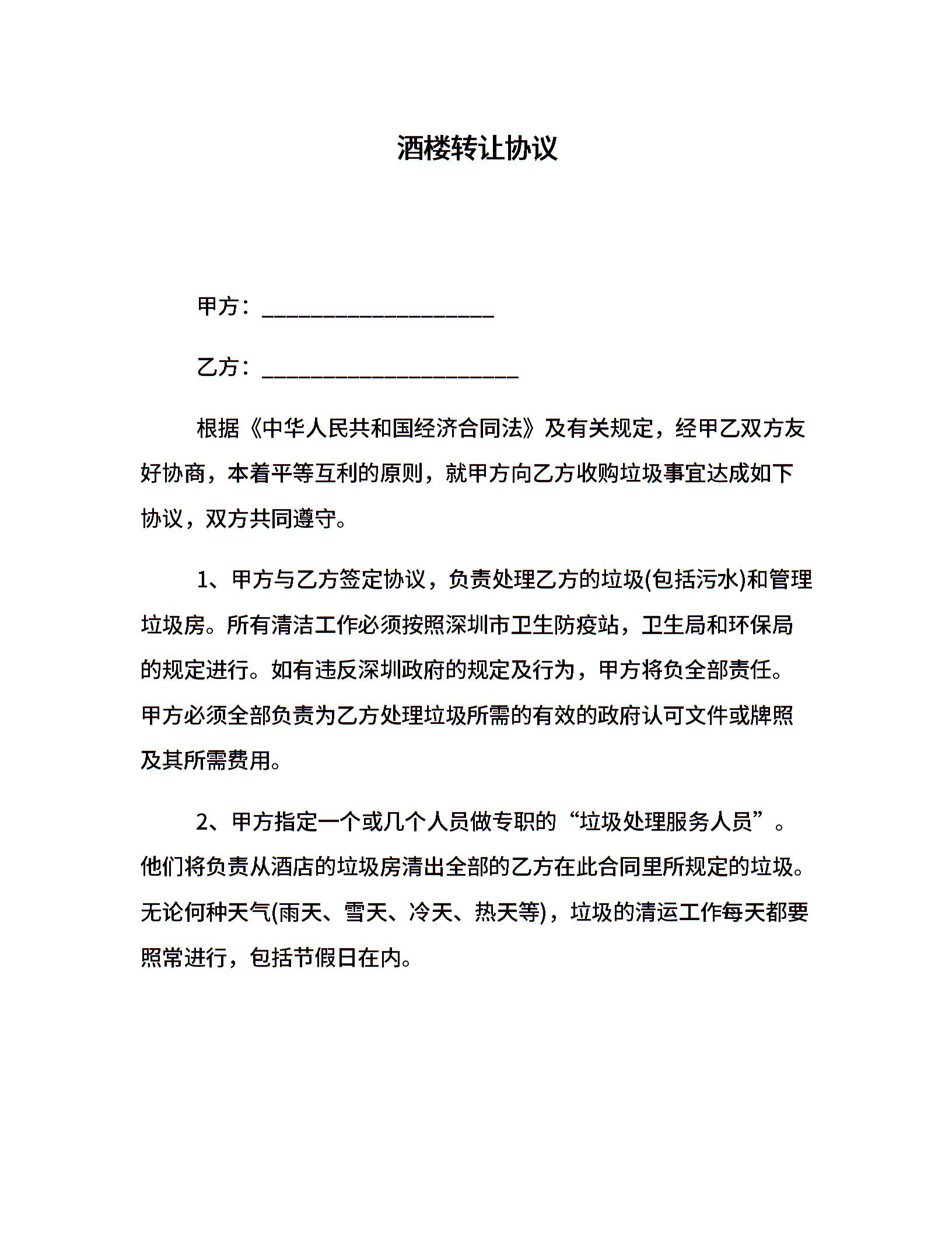 酒楼转让协议