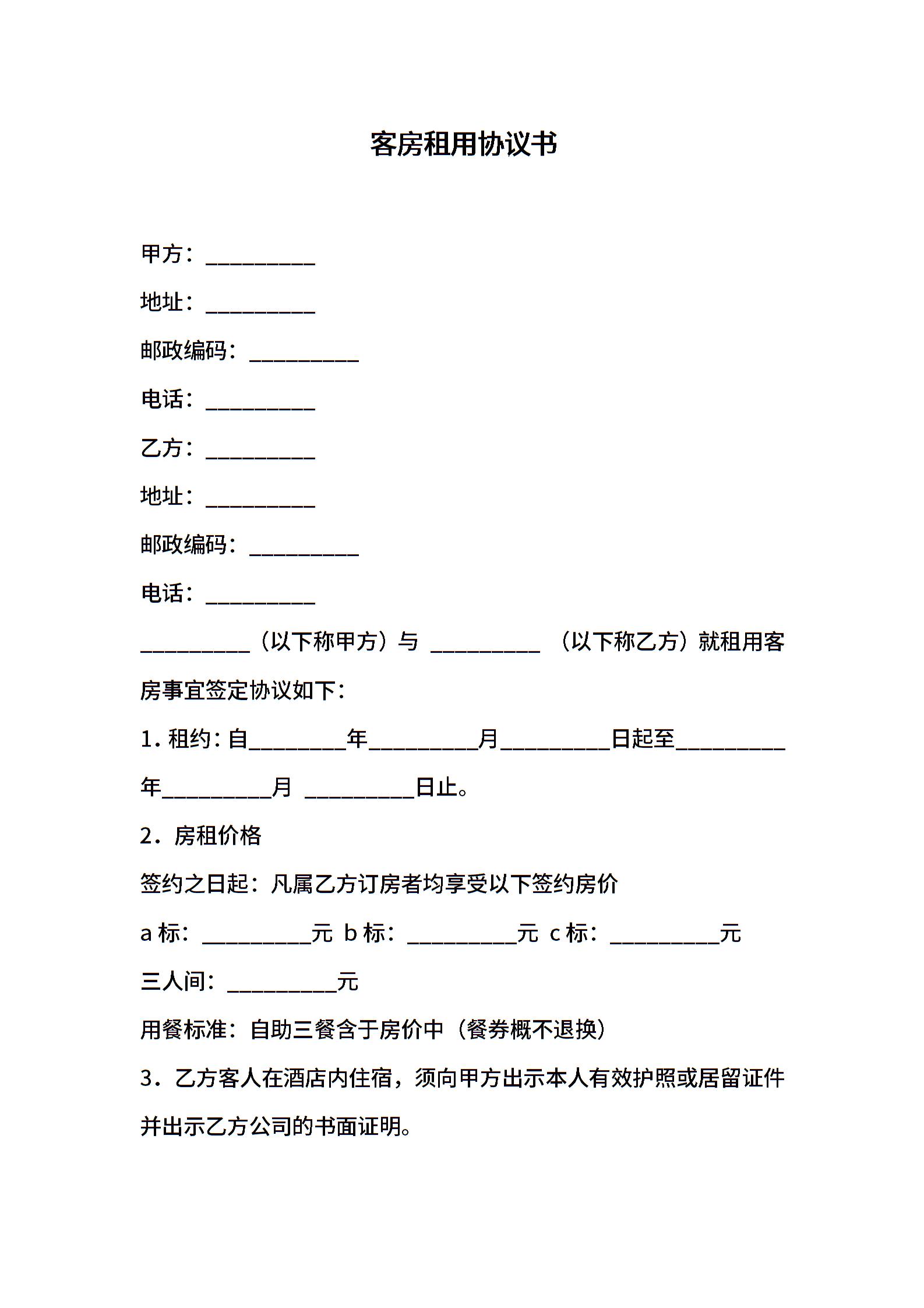 客房租用协议书