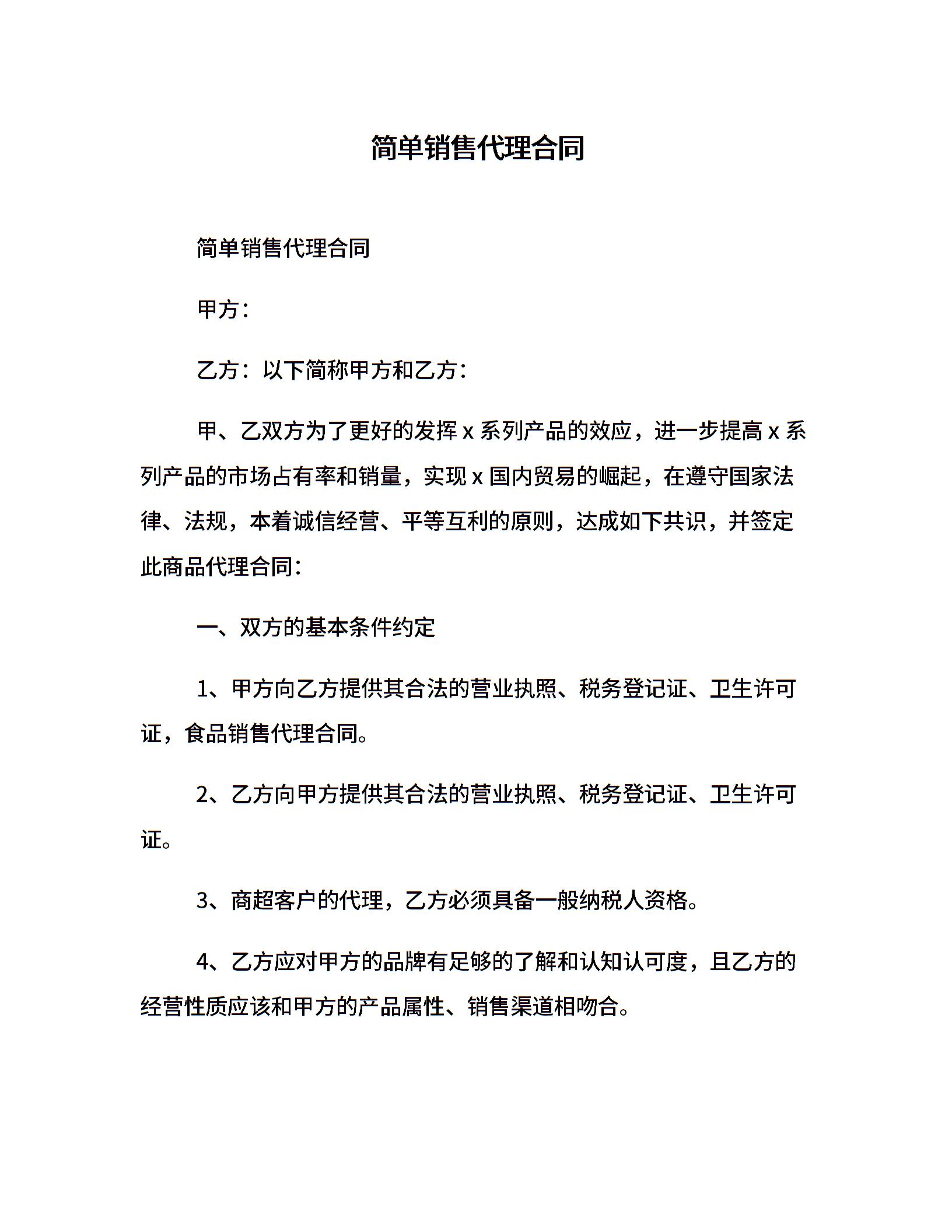 简单销售代理合同