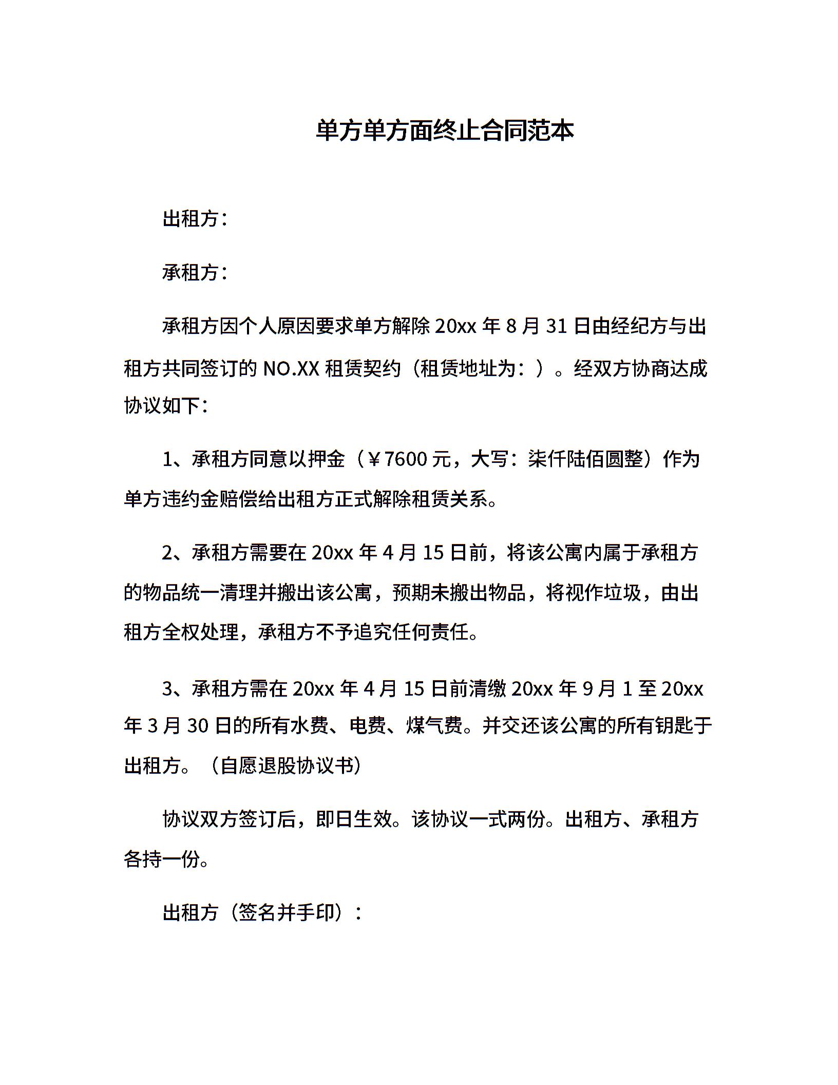 单方单方面终止合同范本