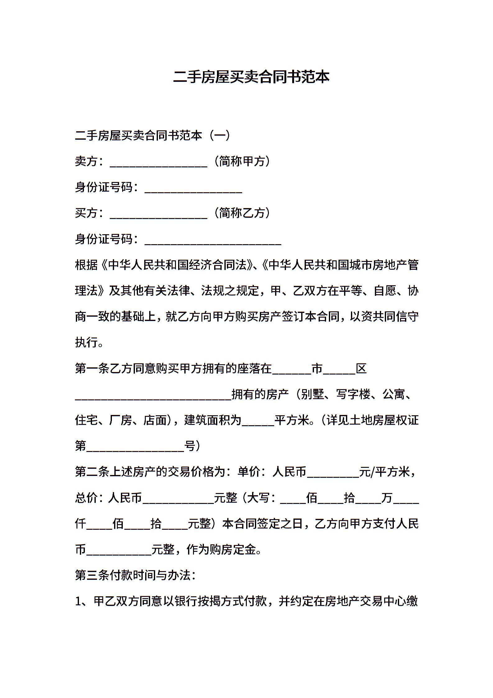 完整二手房屋买卖合同书范本