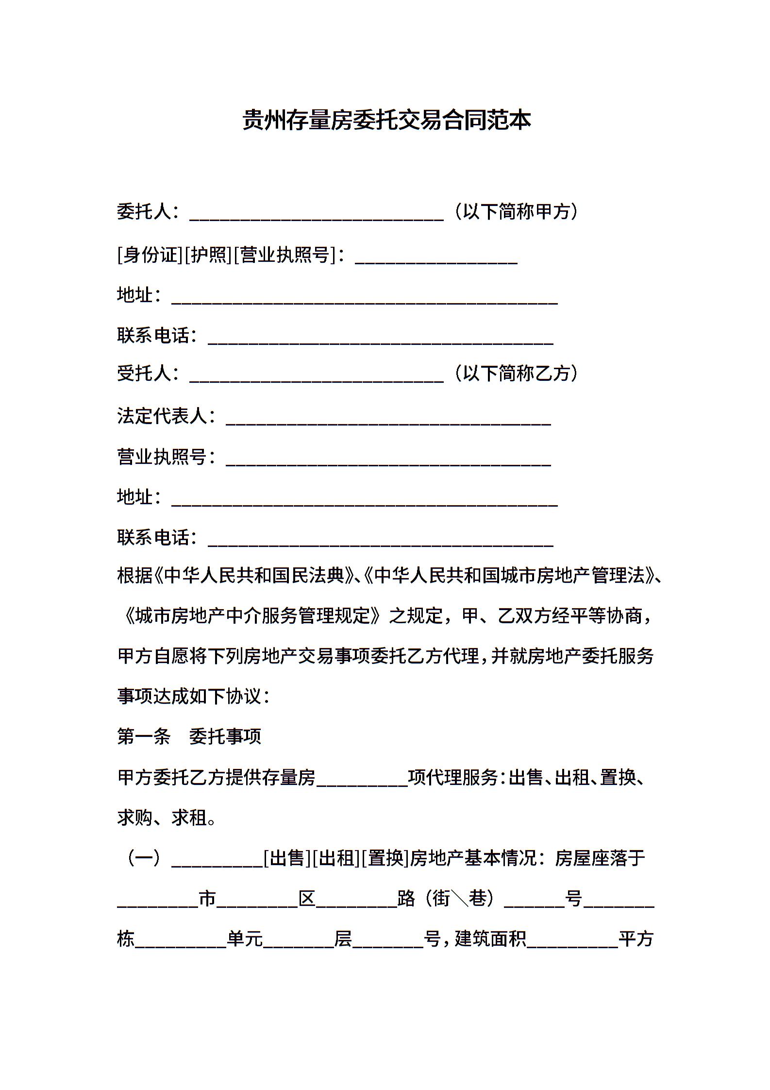 贵州存量房委托交易合同范本