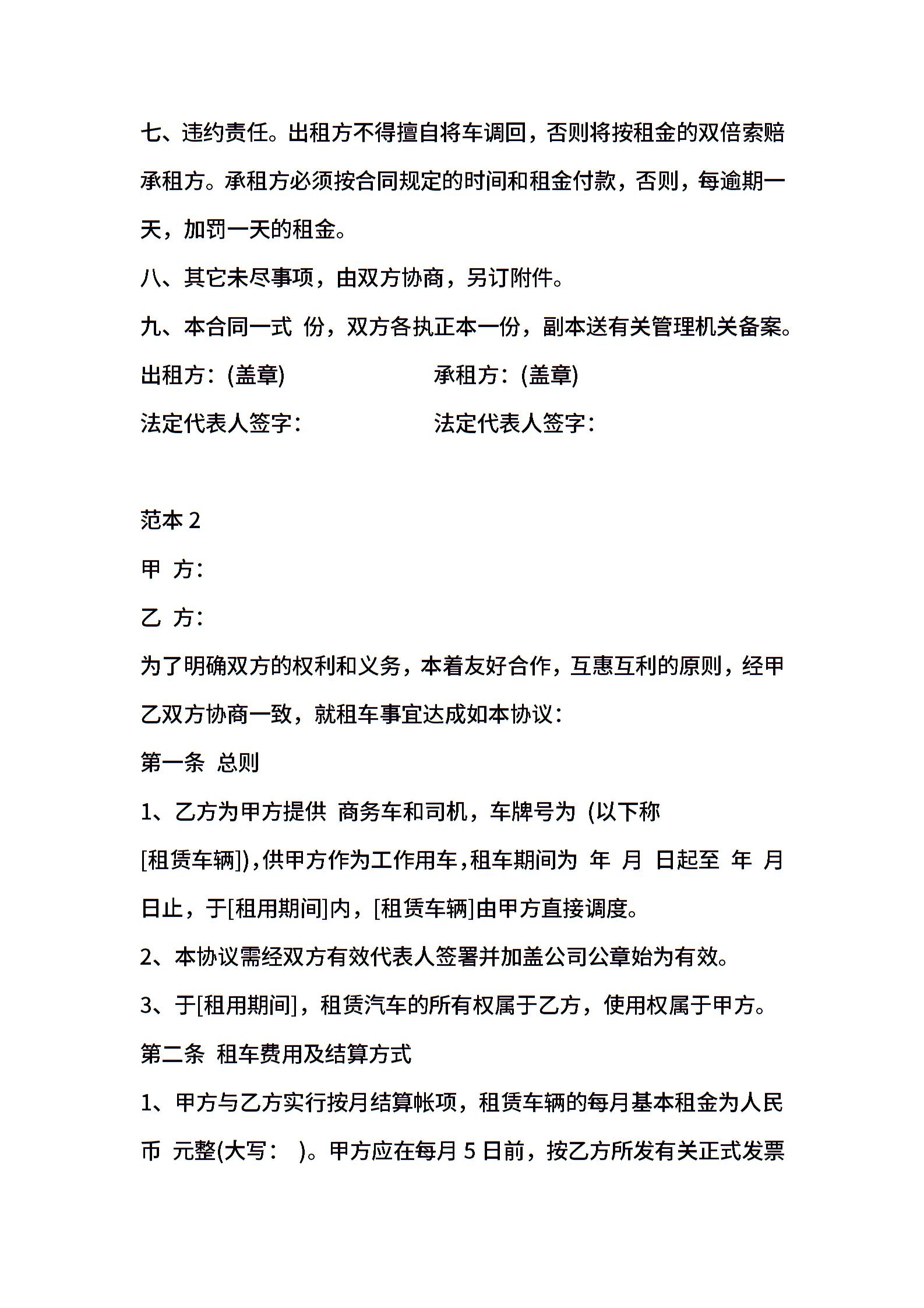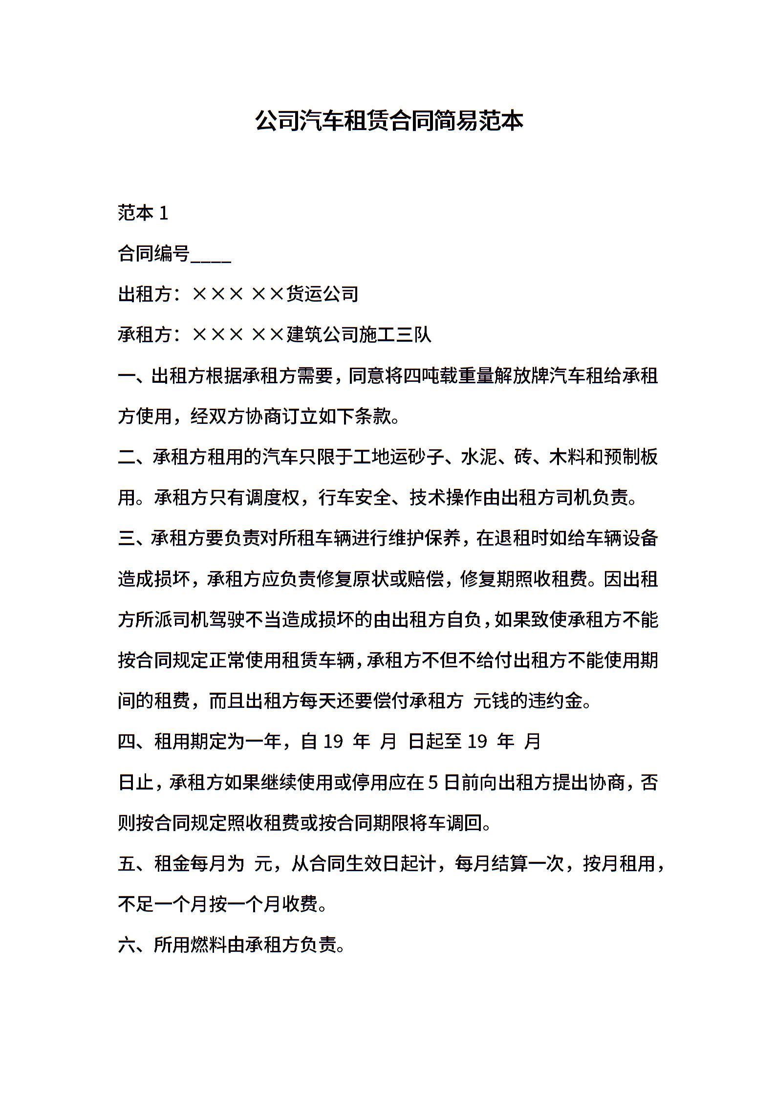 公司汽车租赁合同简易范本
