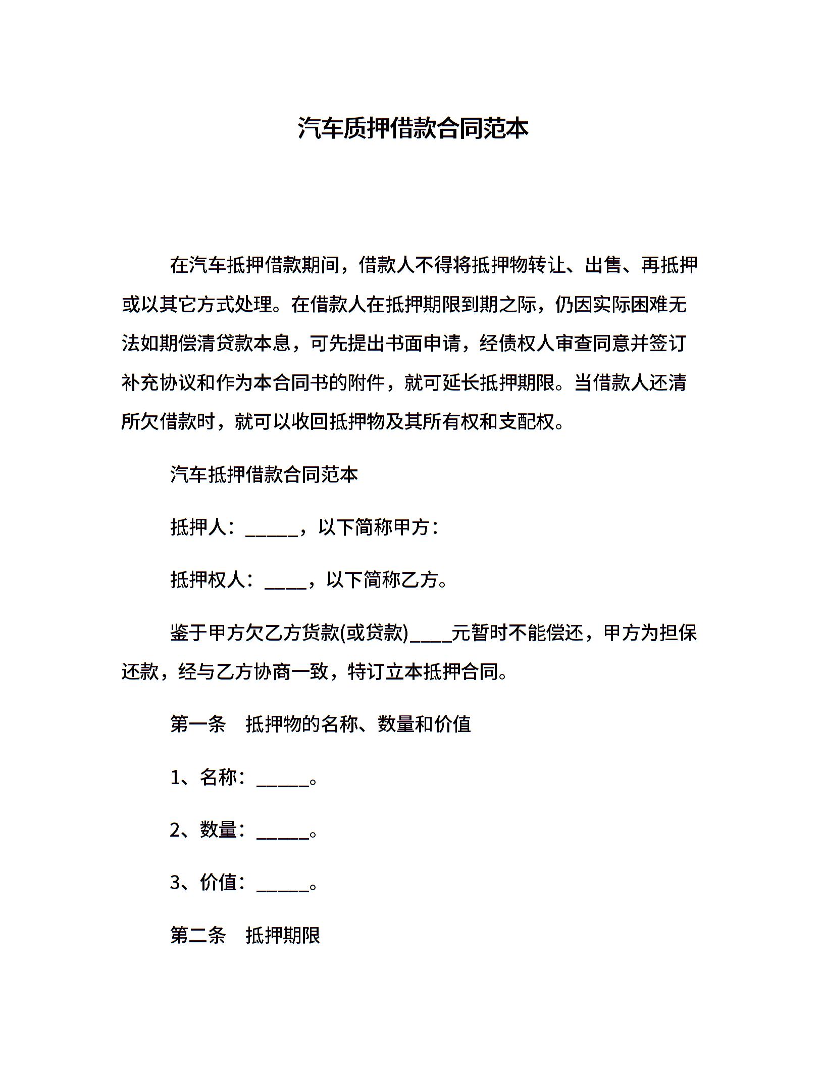 汽车质押借款合同范本