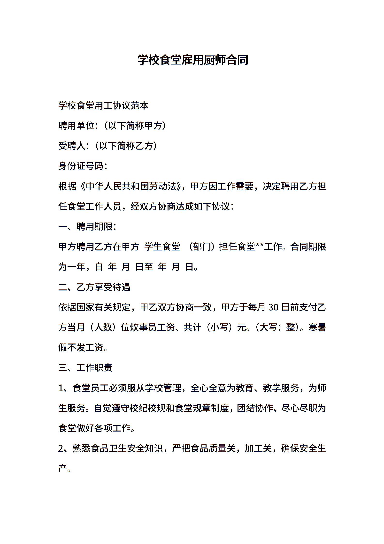 学校食堂雇用厨师合同
