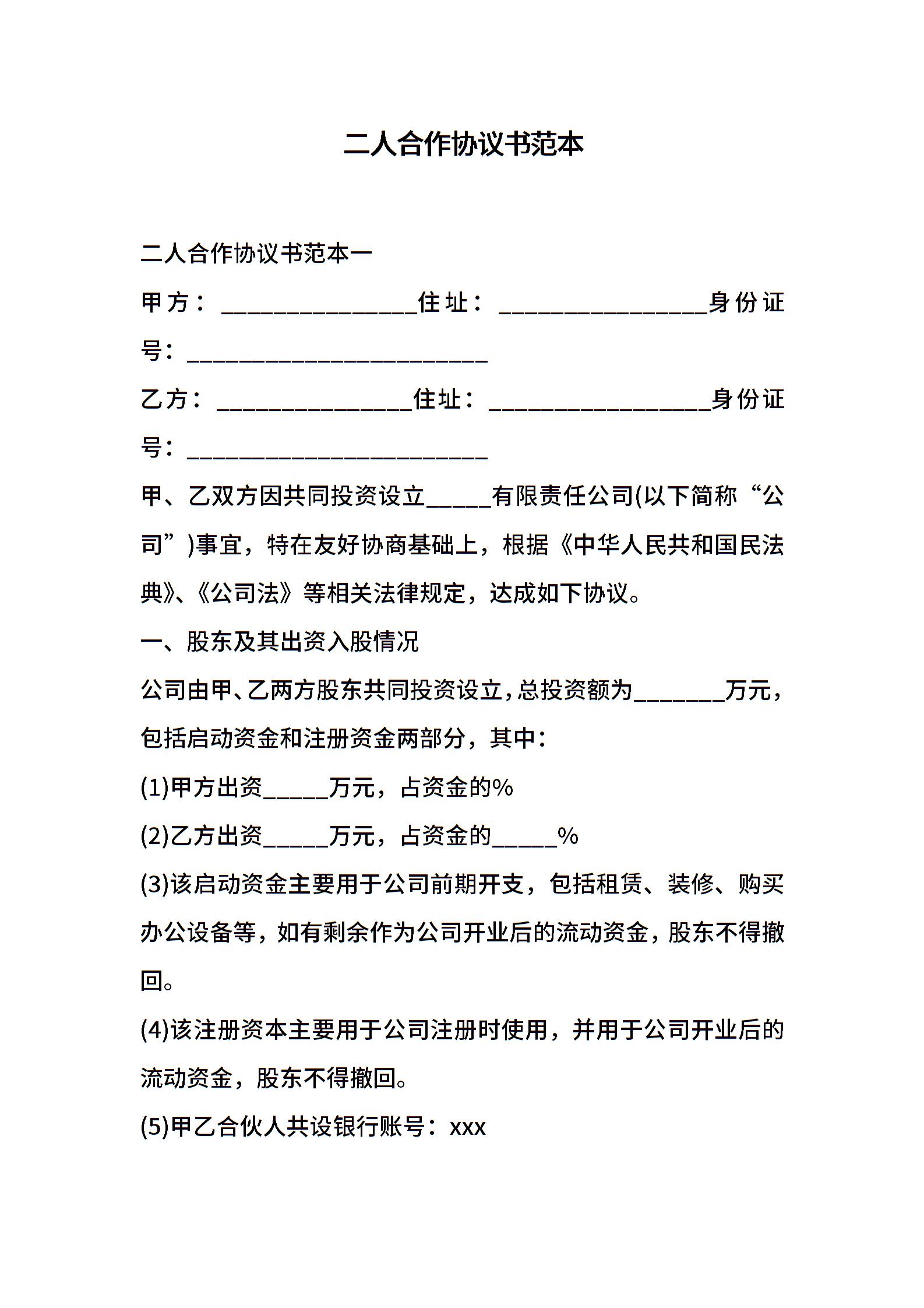 二人合作协议书范本
