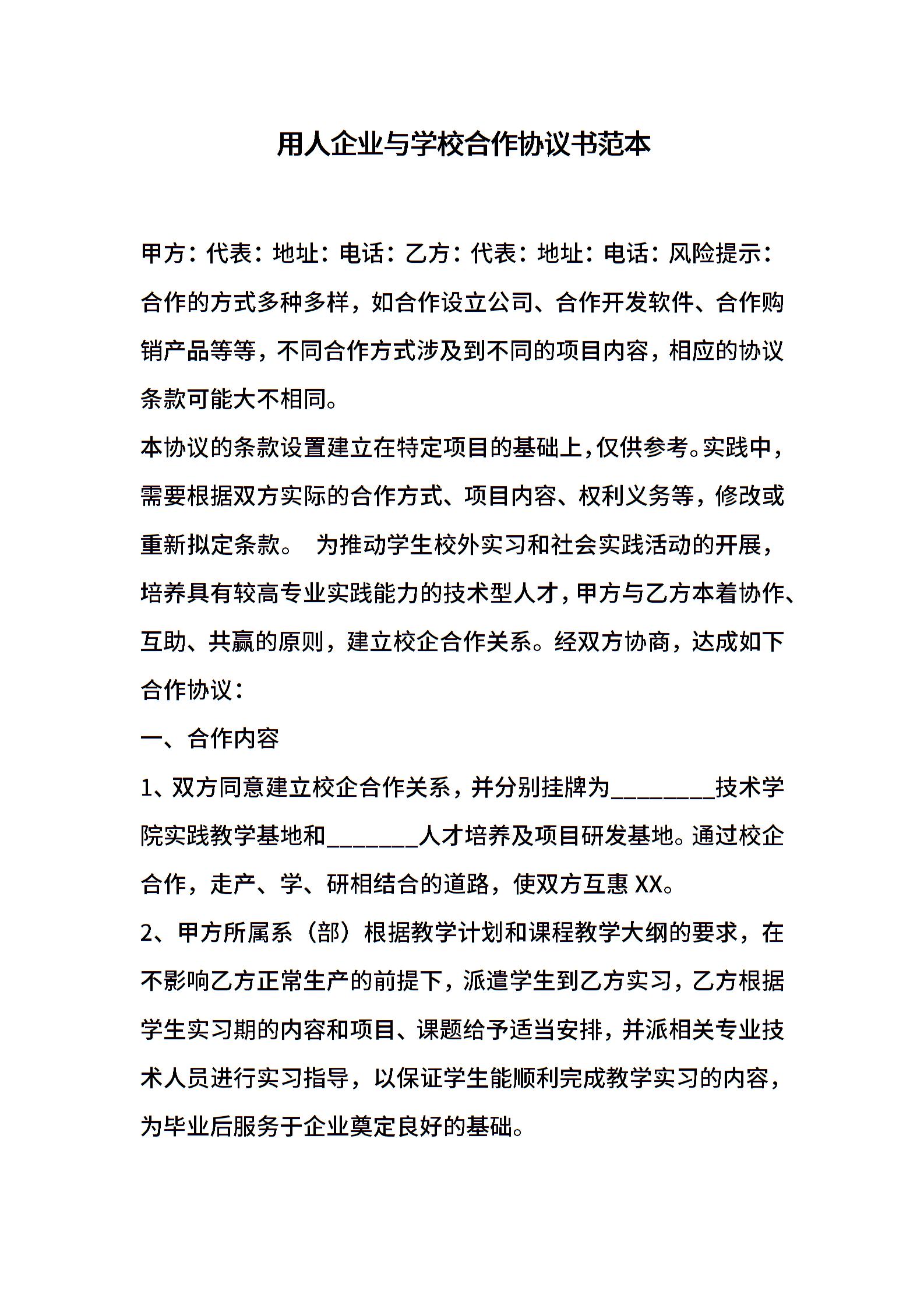用人企业与学校合作协议书范本