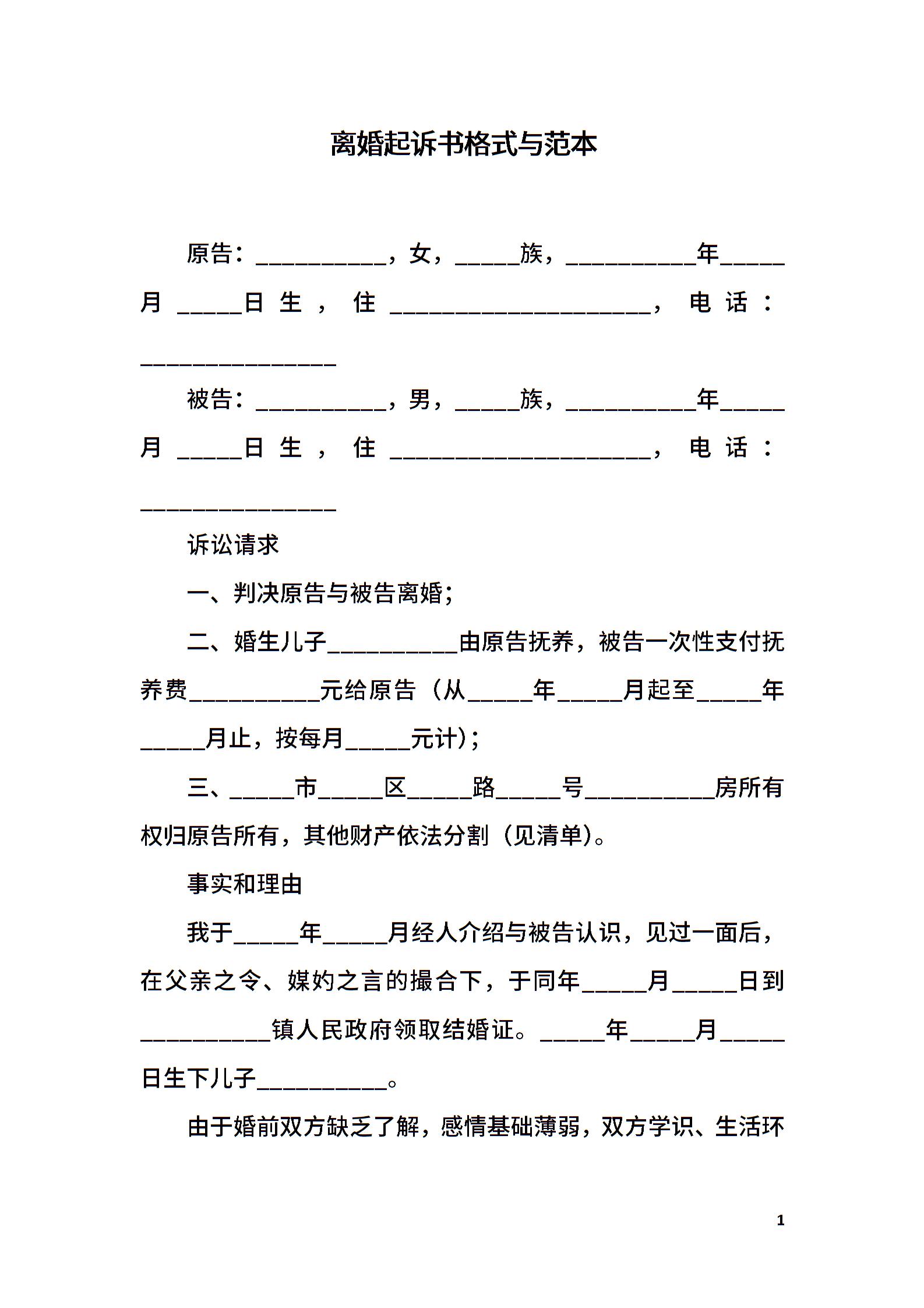 离婚起诉书格式与范本