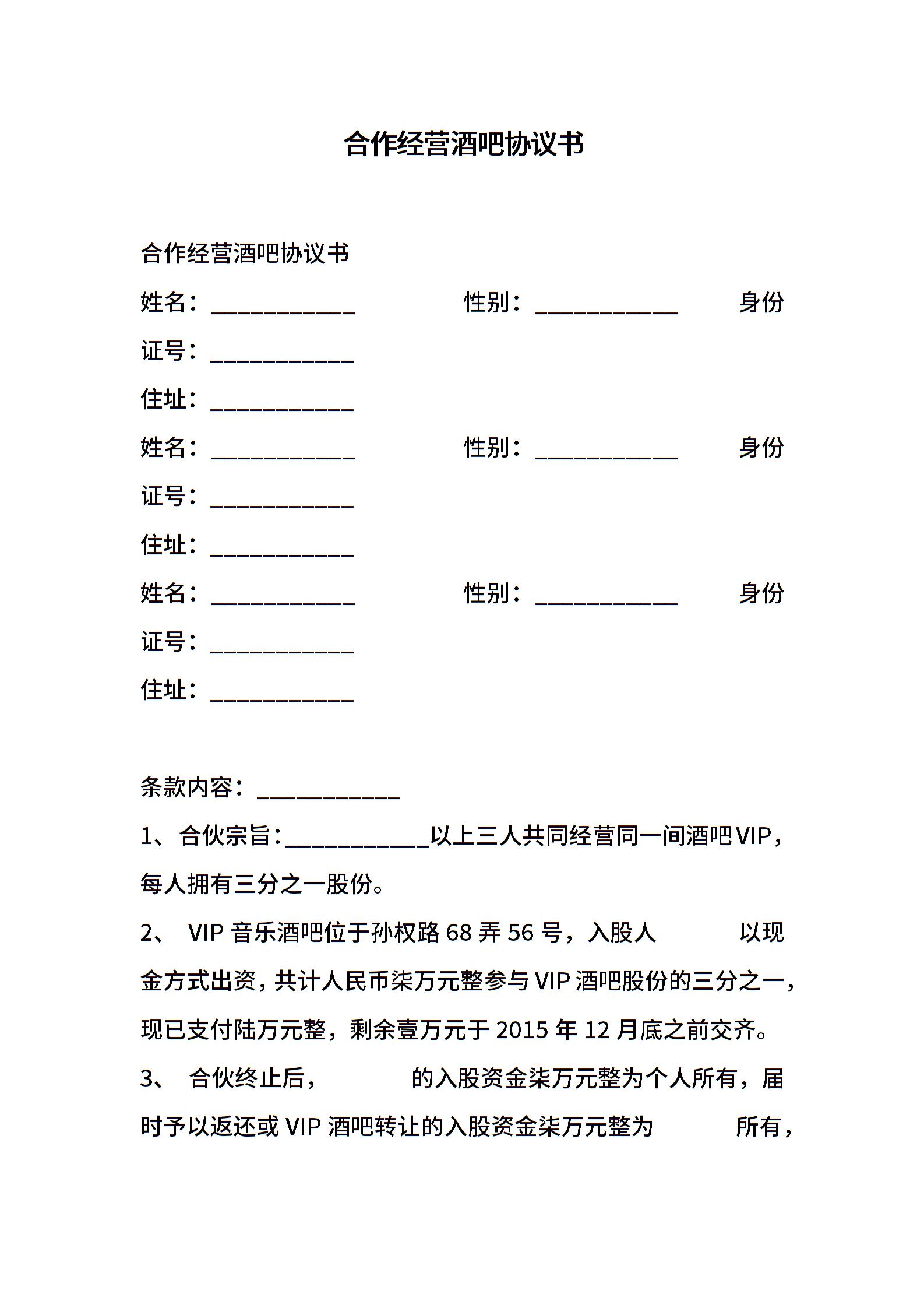 合作经营酒吧协议书