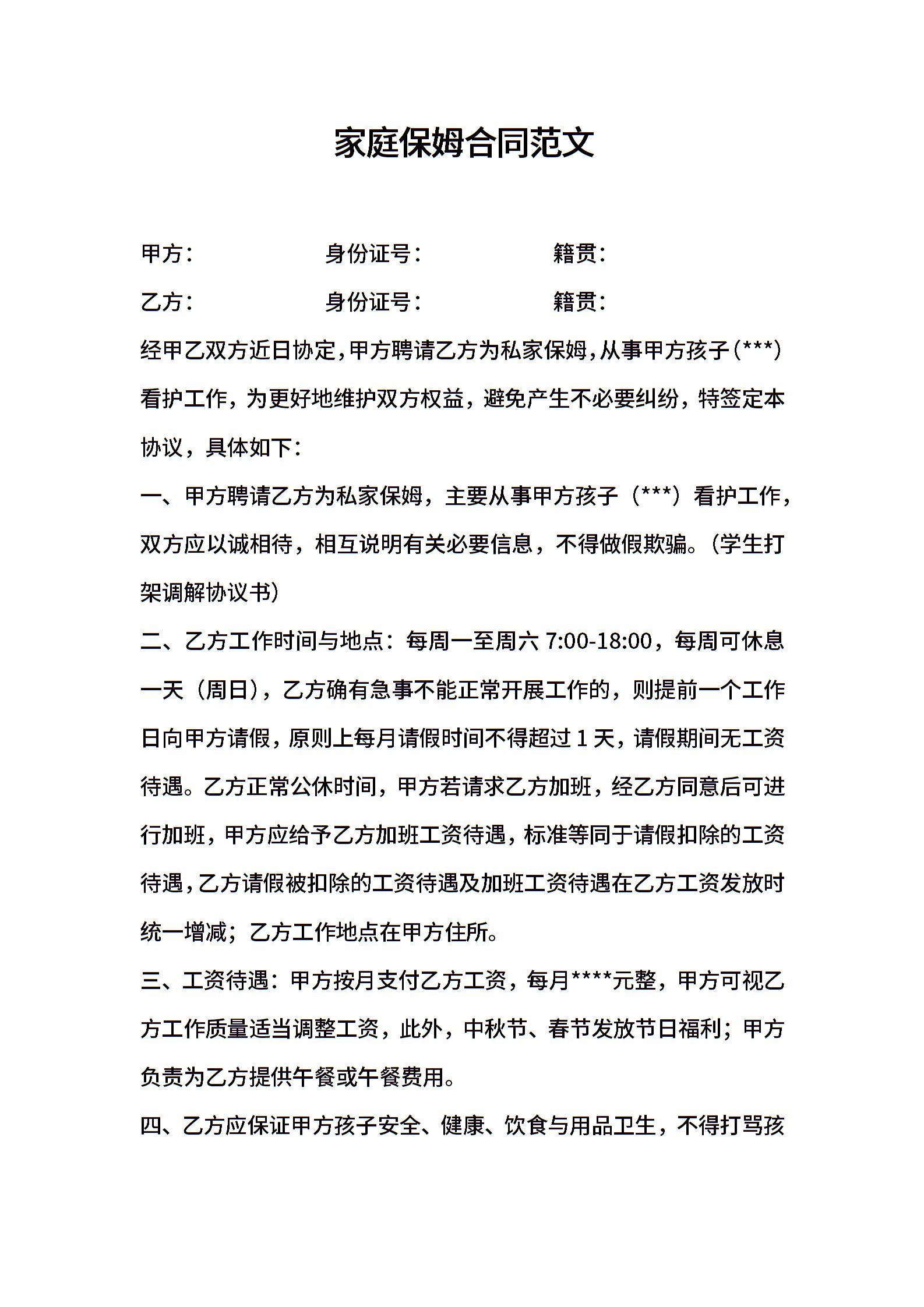 家庭保姆合同范文