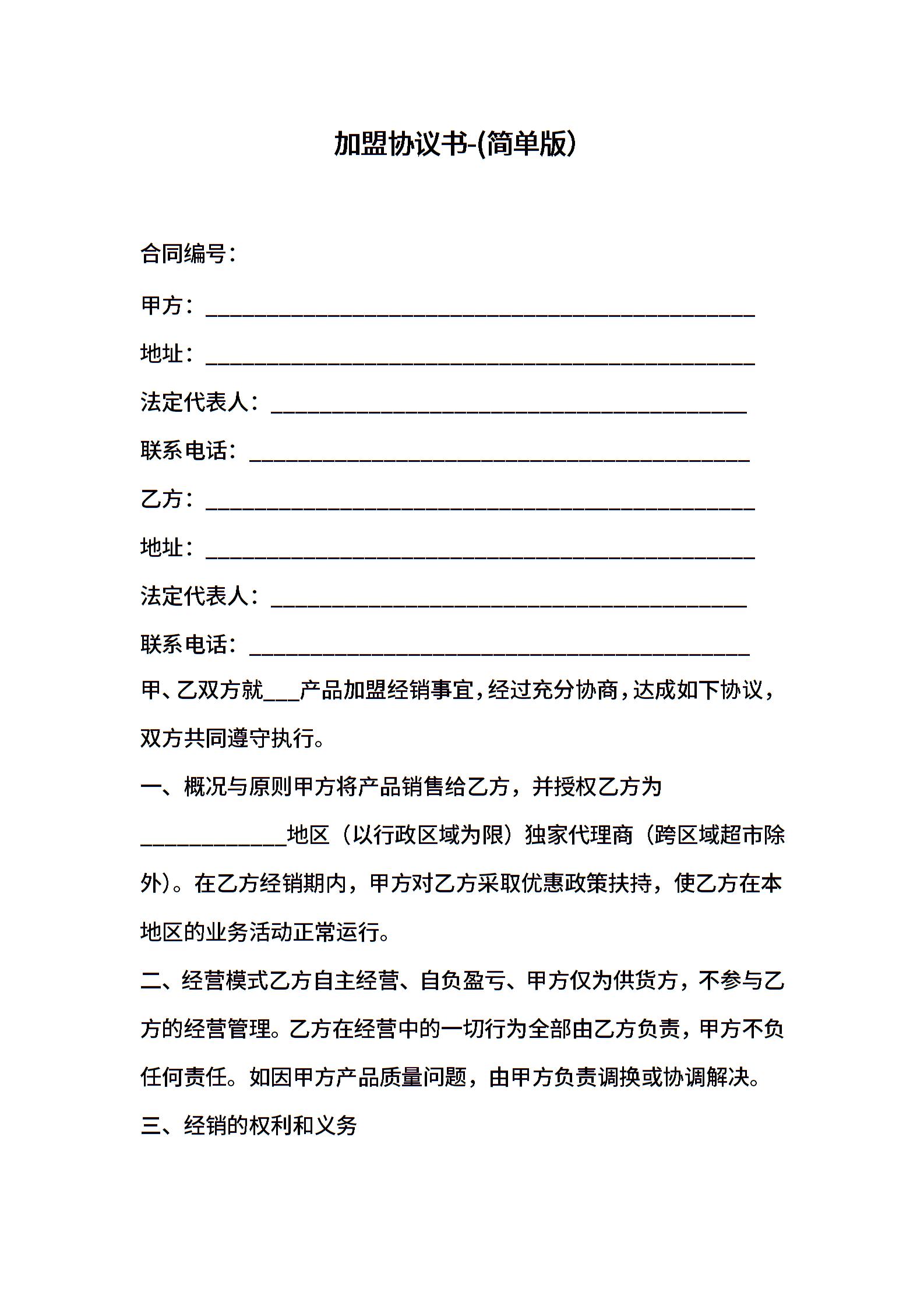 加盟协议书-(简单版)