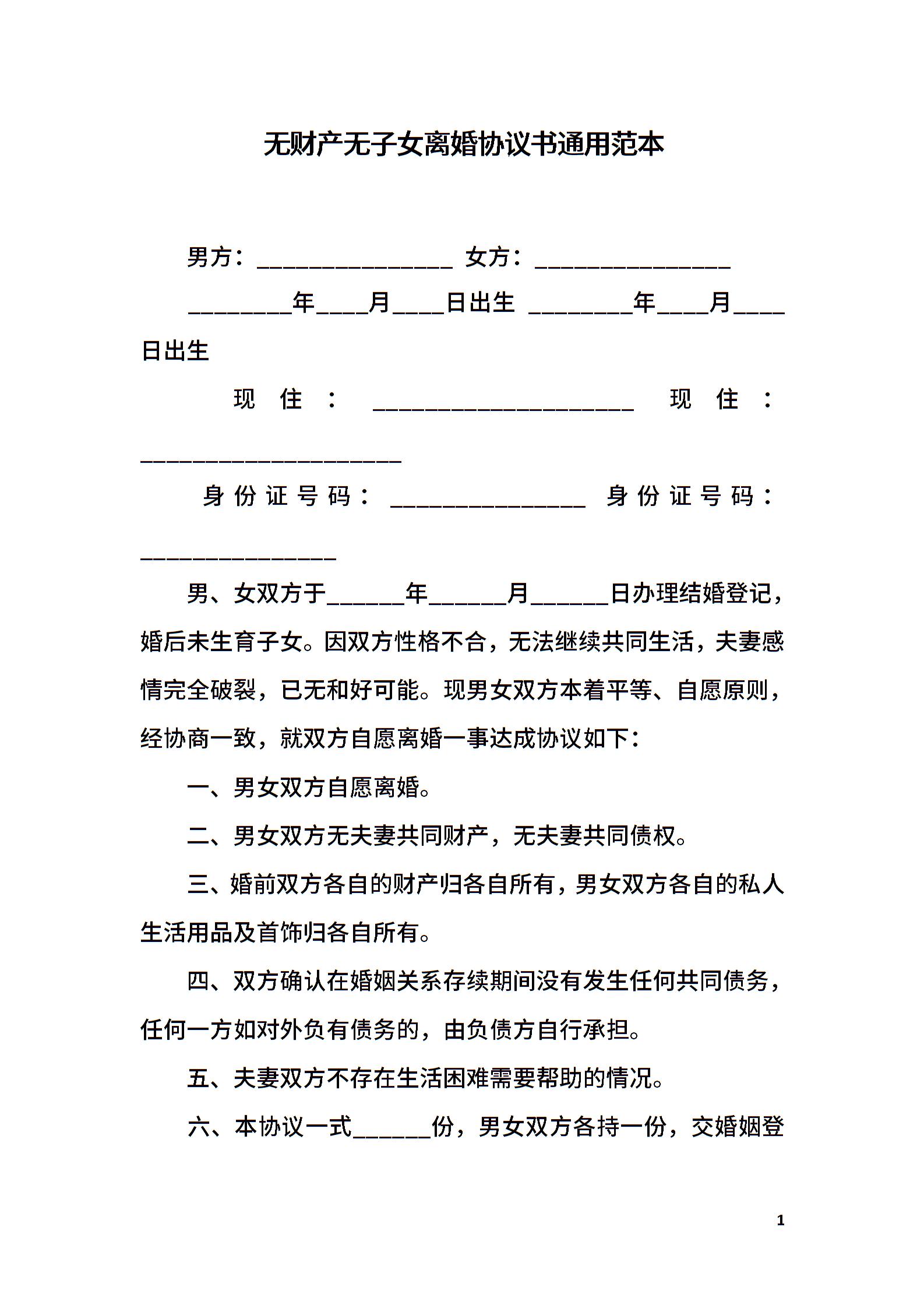无财产无子女离婚协议书通用范本