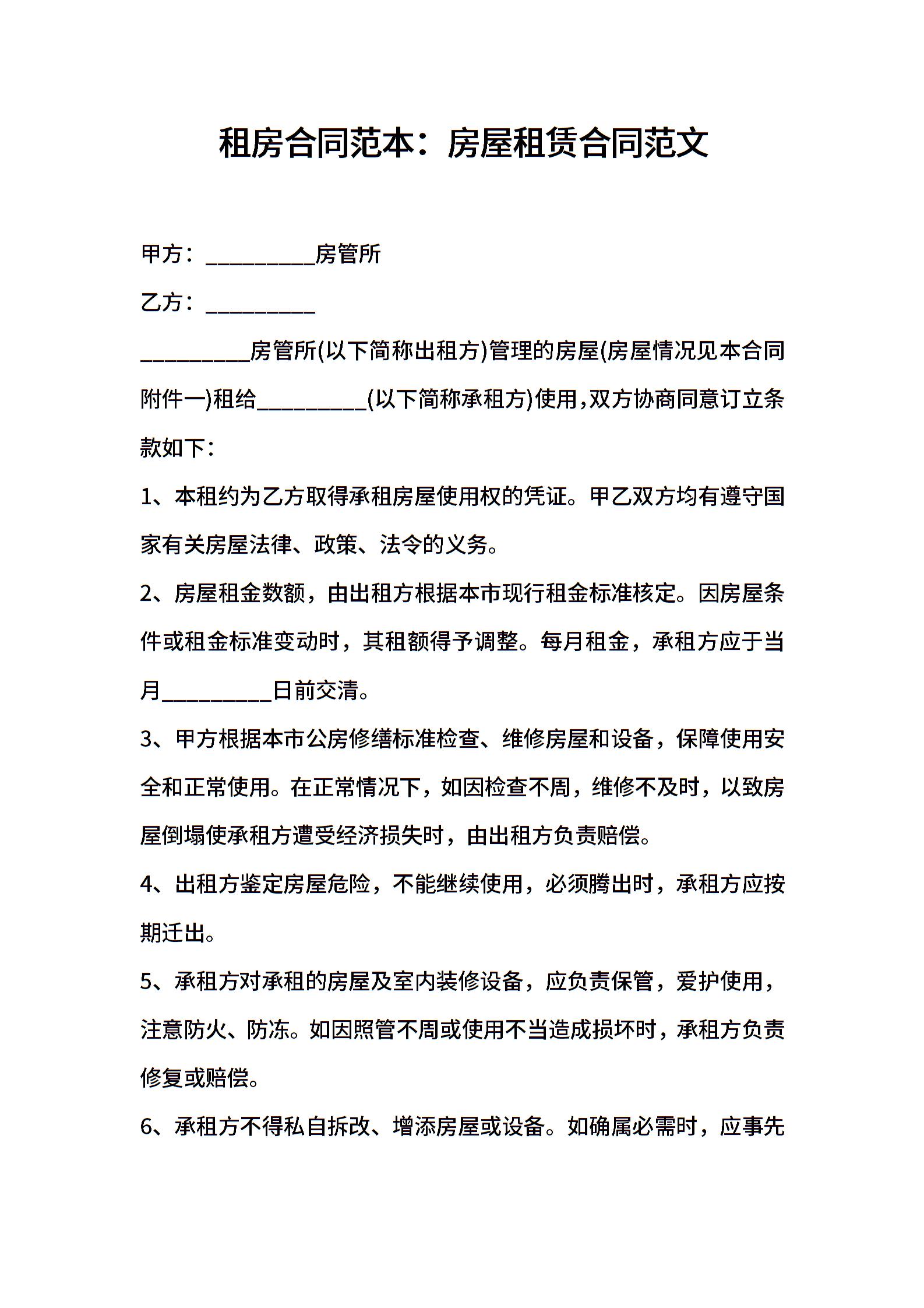 租房合同范本:房屋租赁合同范文