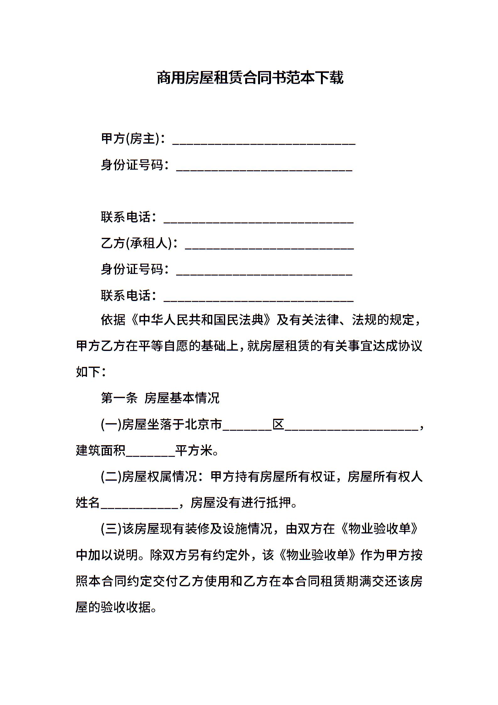 商用房屋租赁合同书范本下载