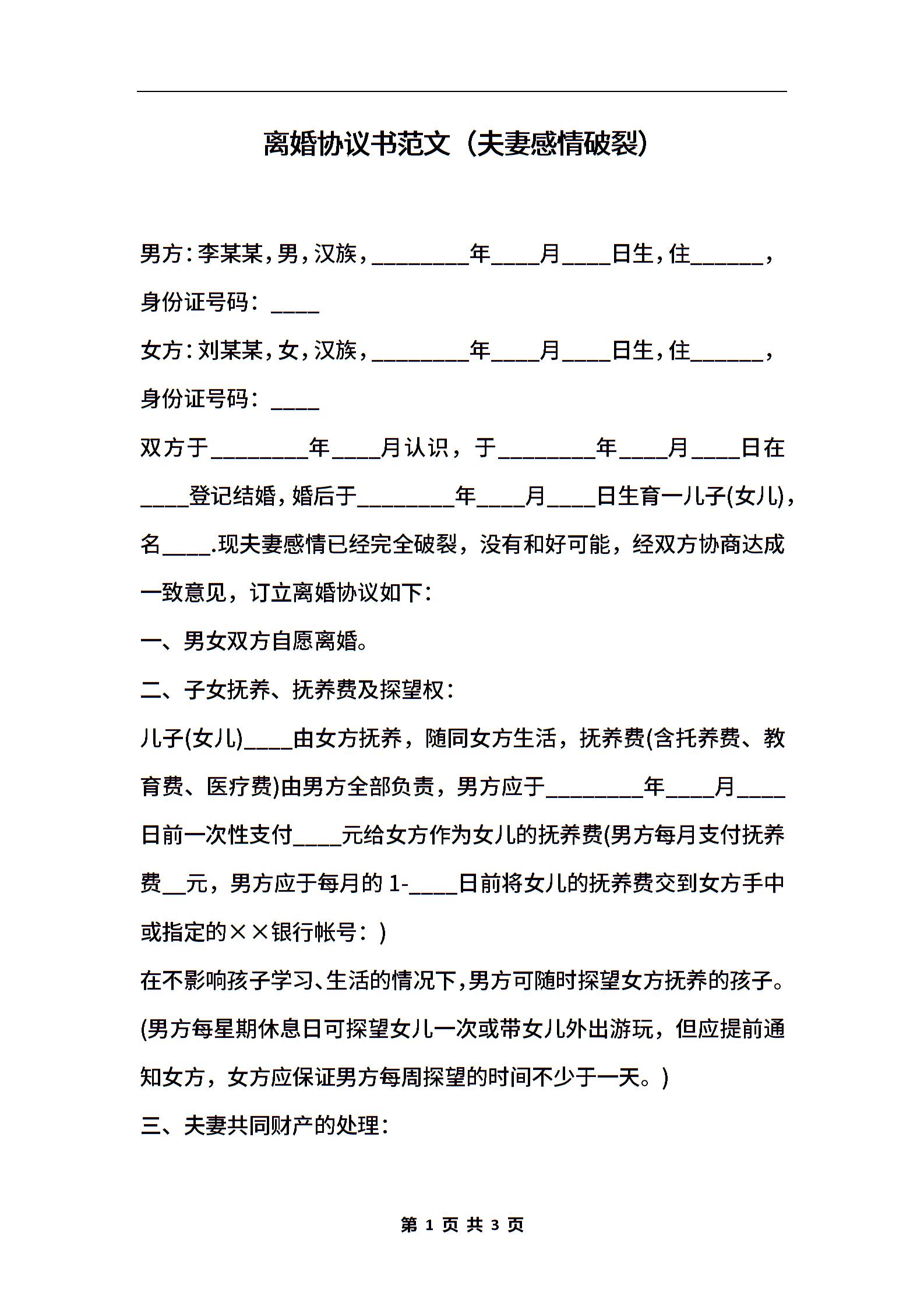 离婚协议书范文(夫妻感情破裂)