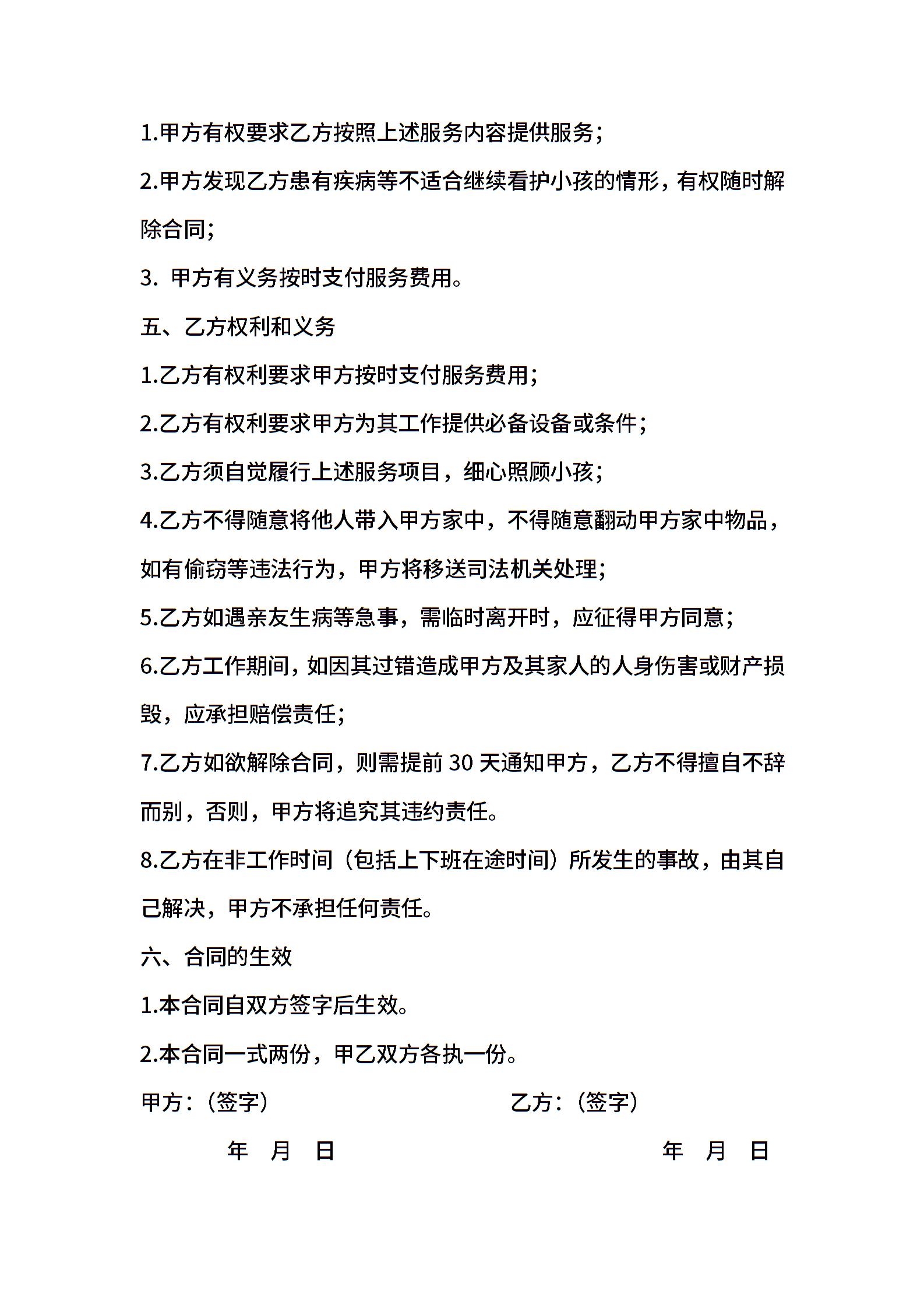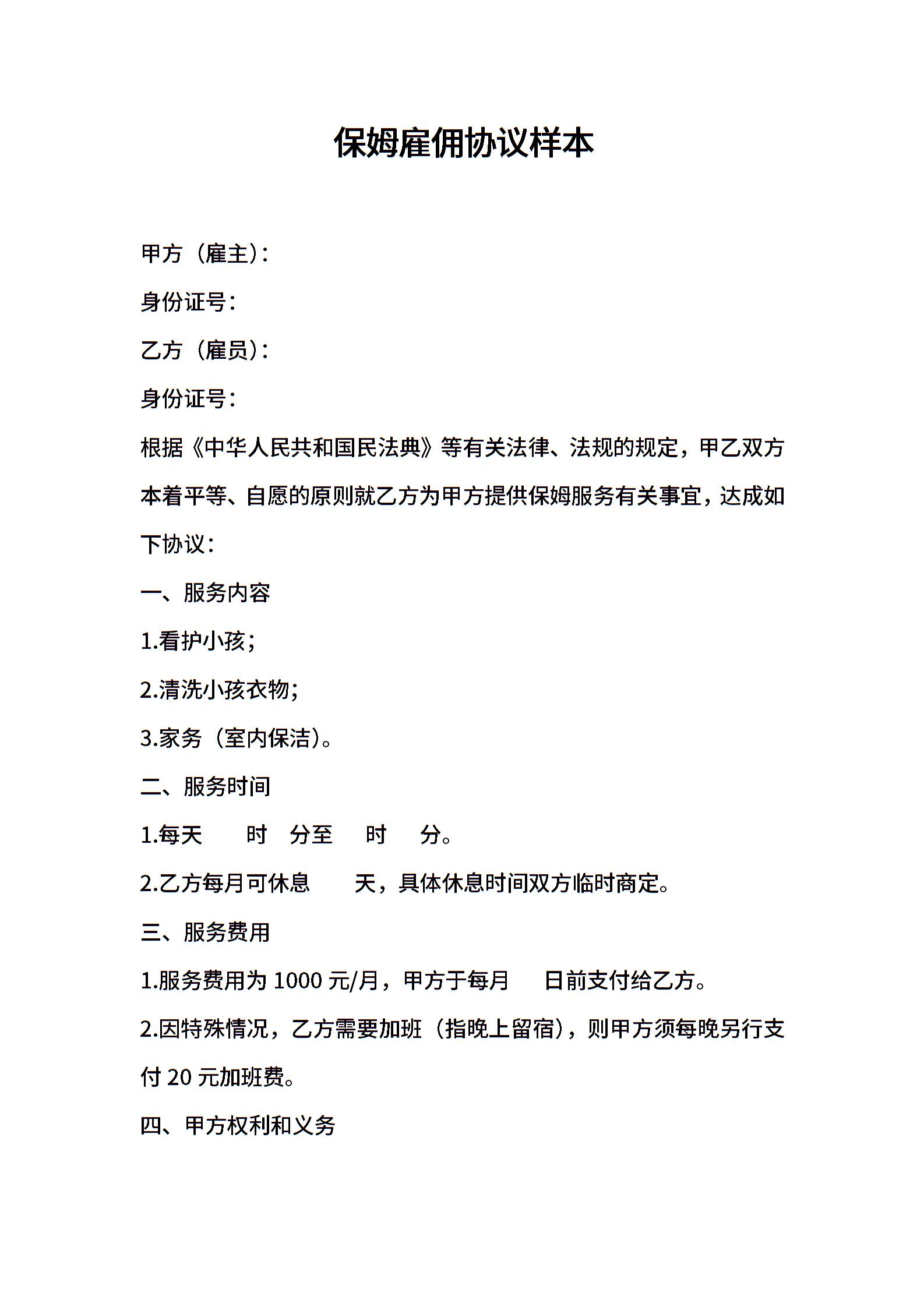保姆雇佣协议样本