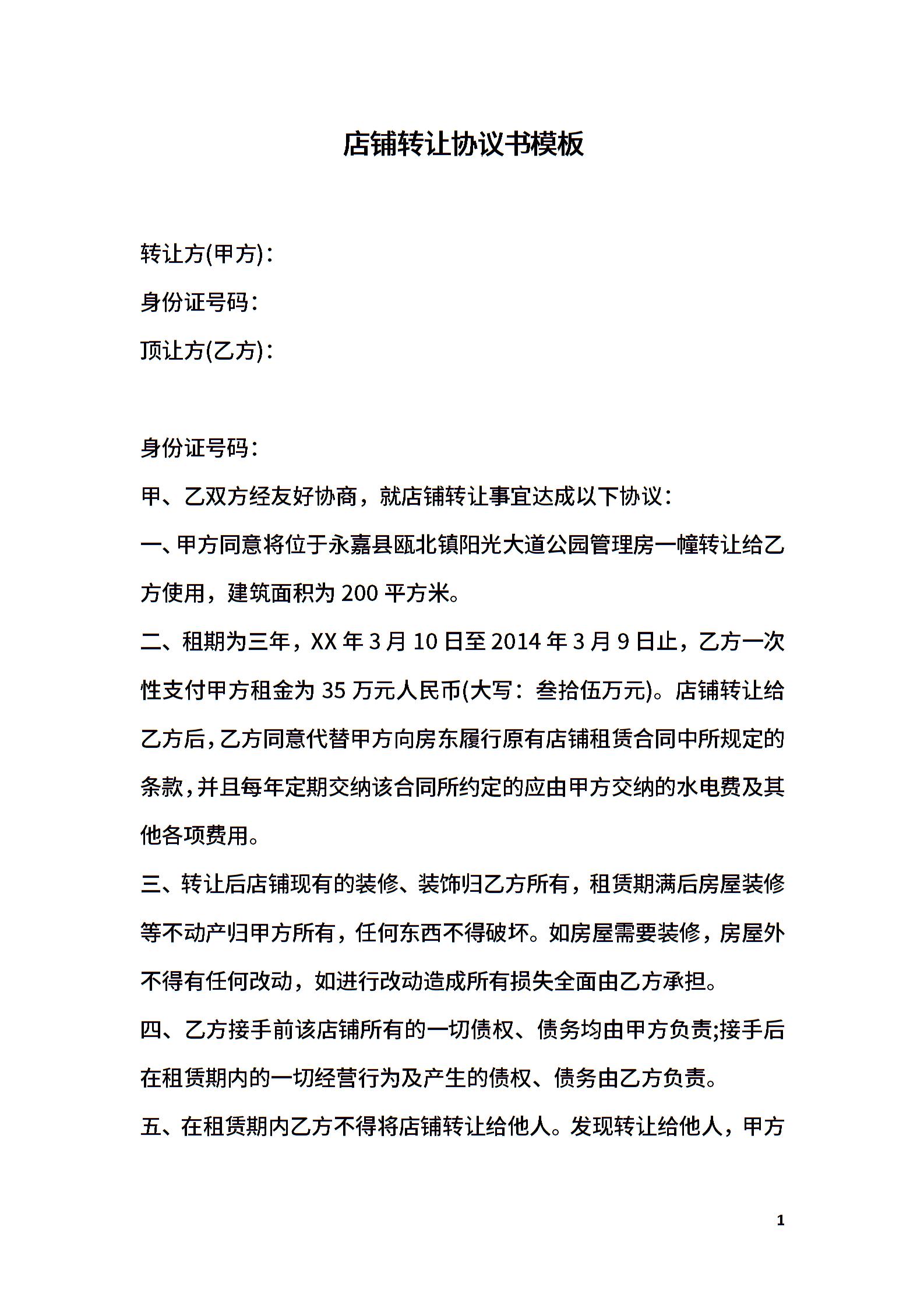 店铺转让协议书模板