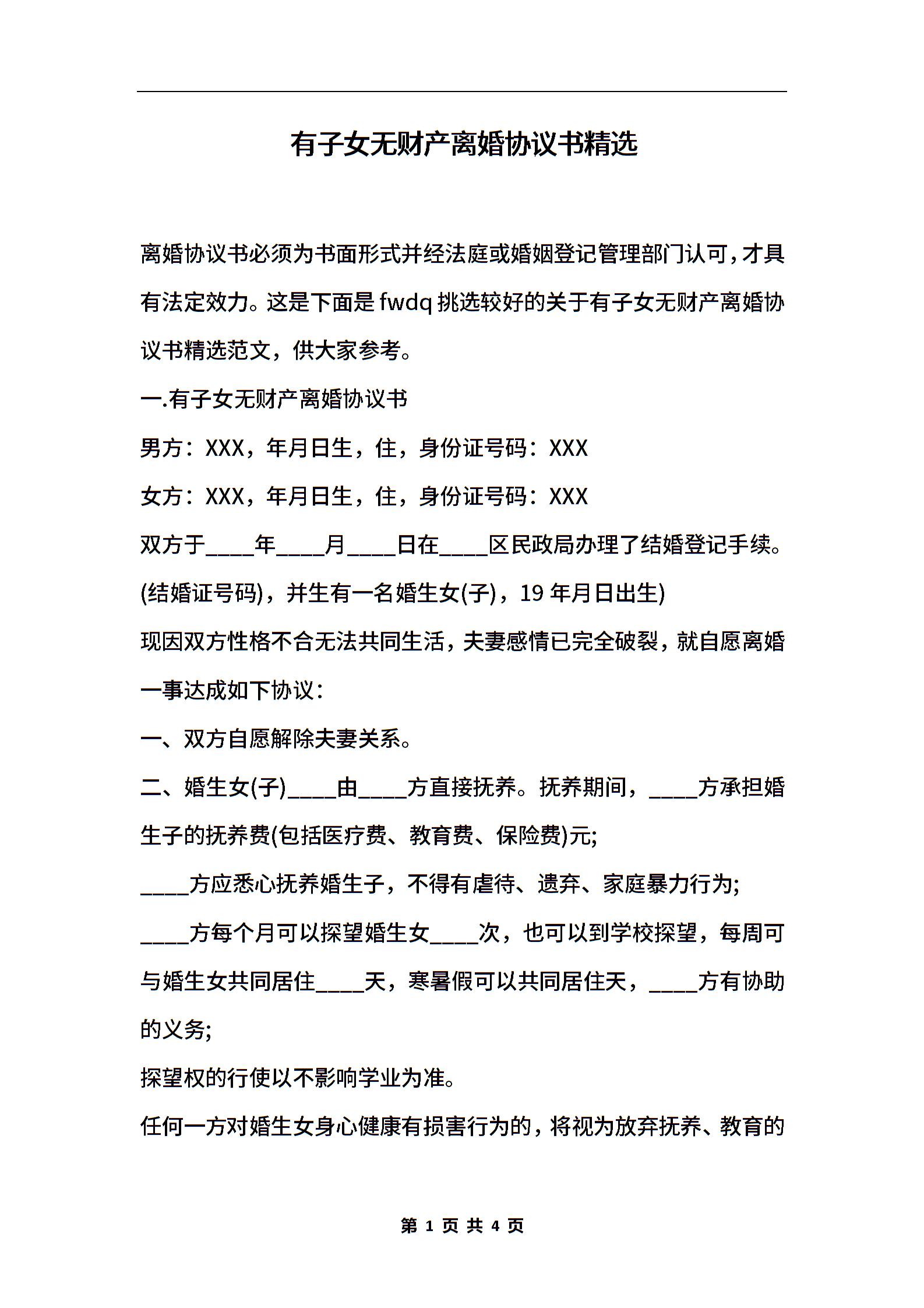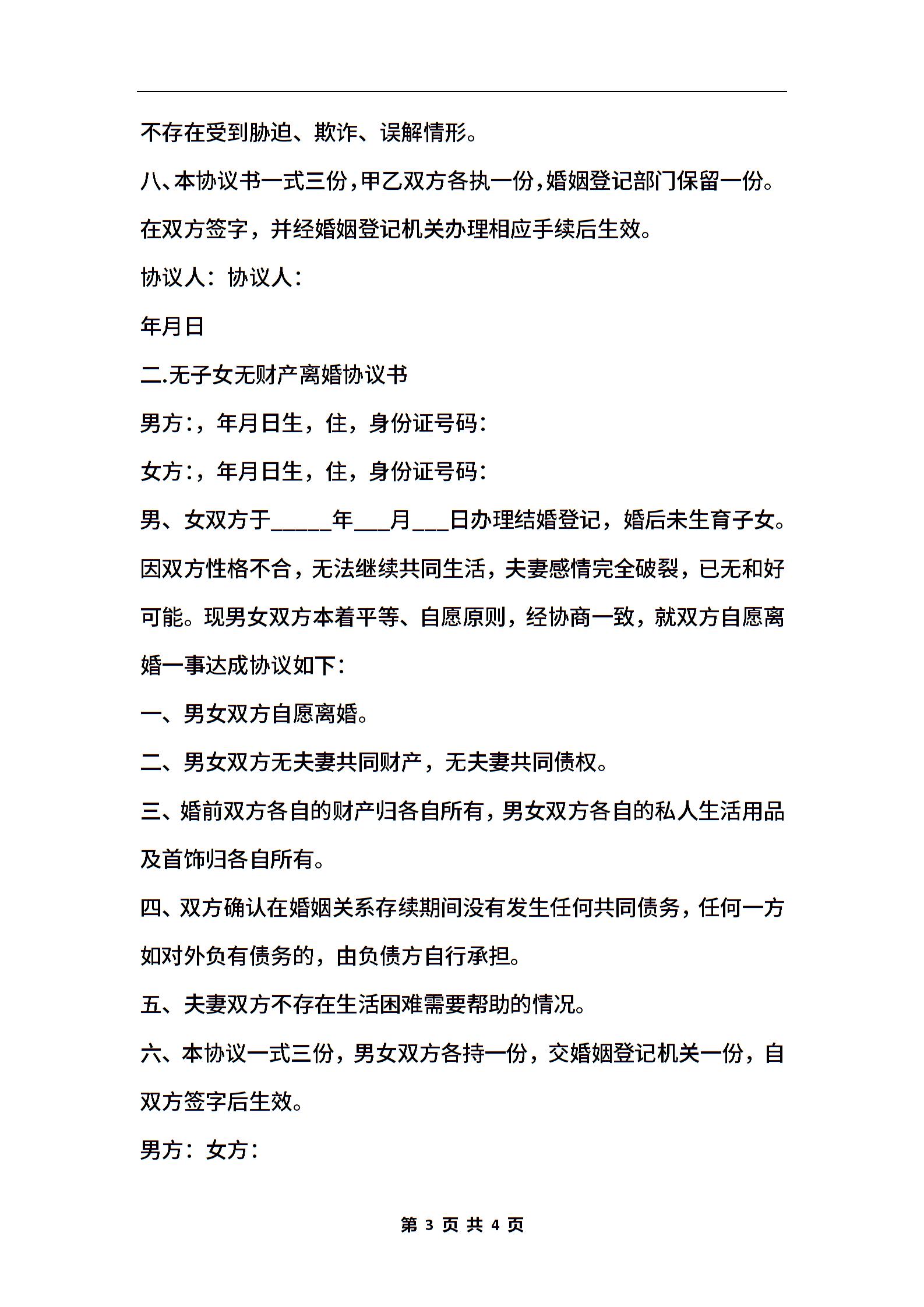 有子女无财产离婚协议书精选
