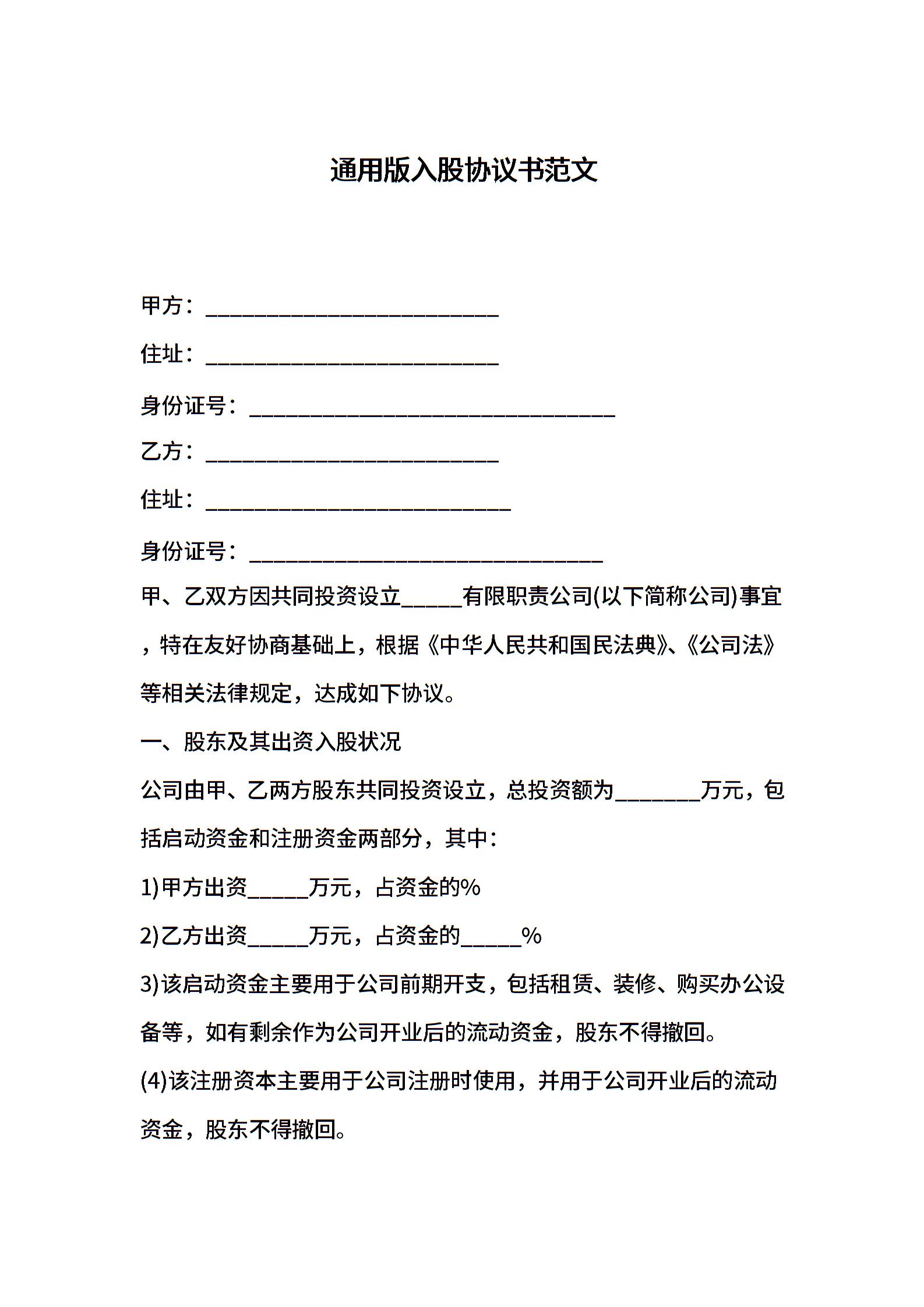 通用版入股协议书范文