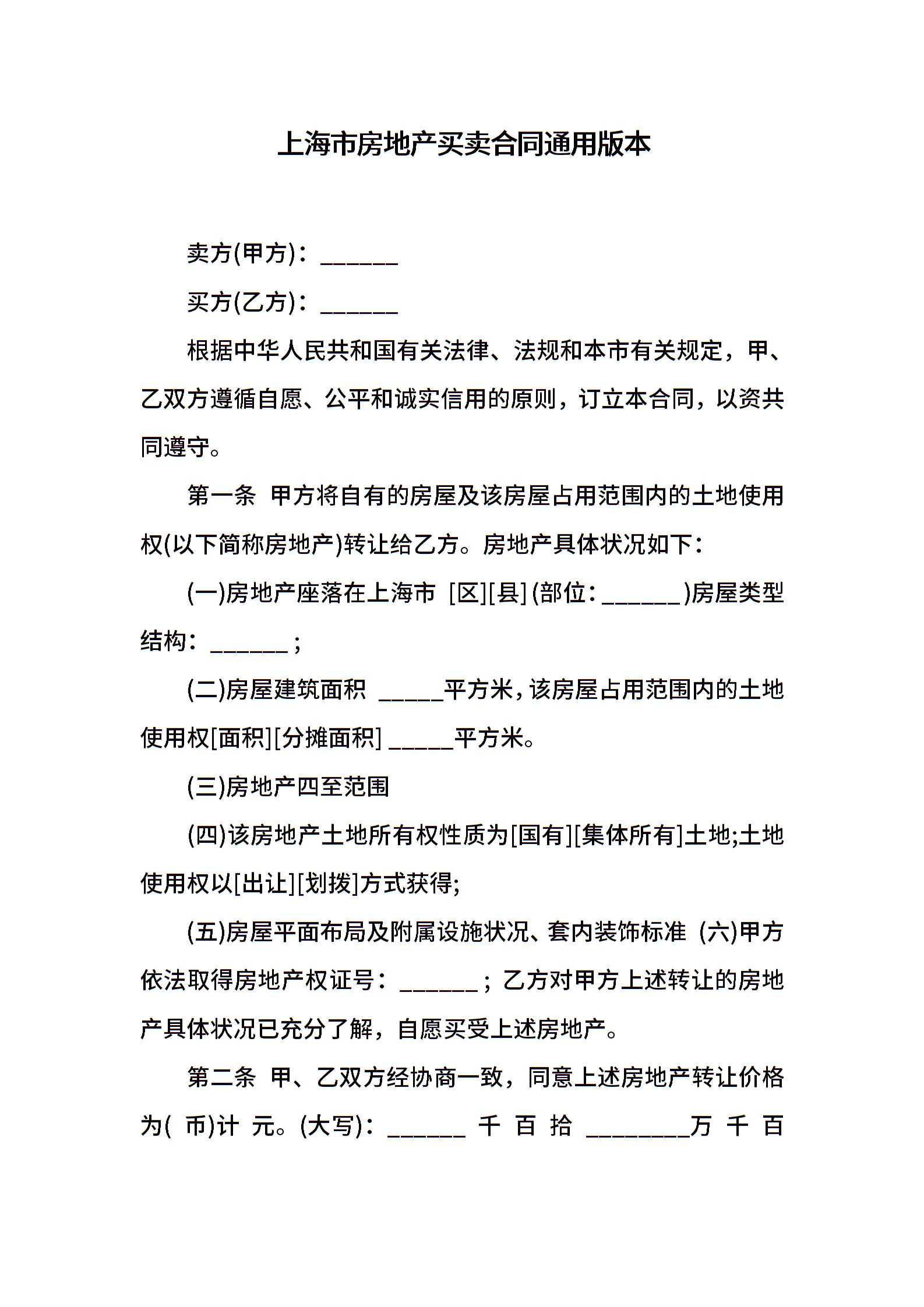 上海市房地产买卖合同通用版本