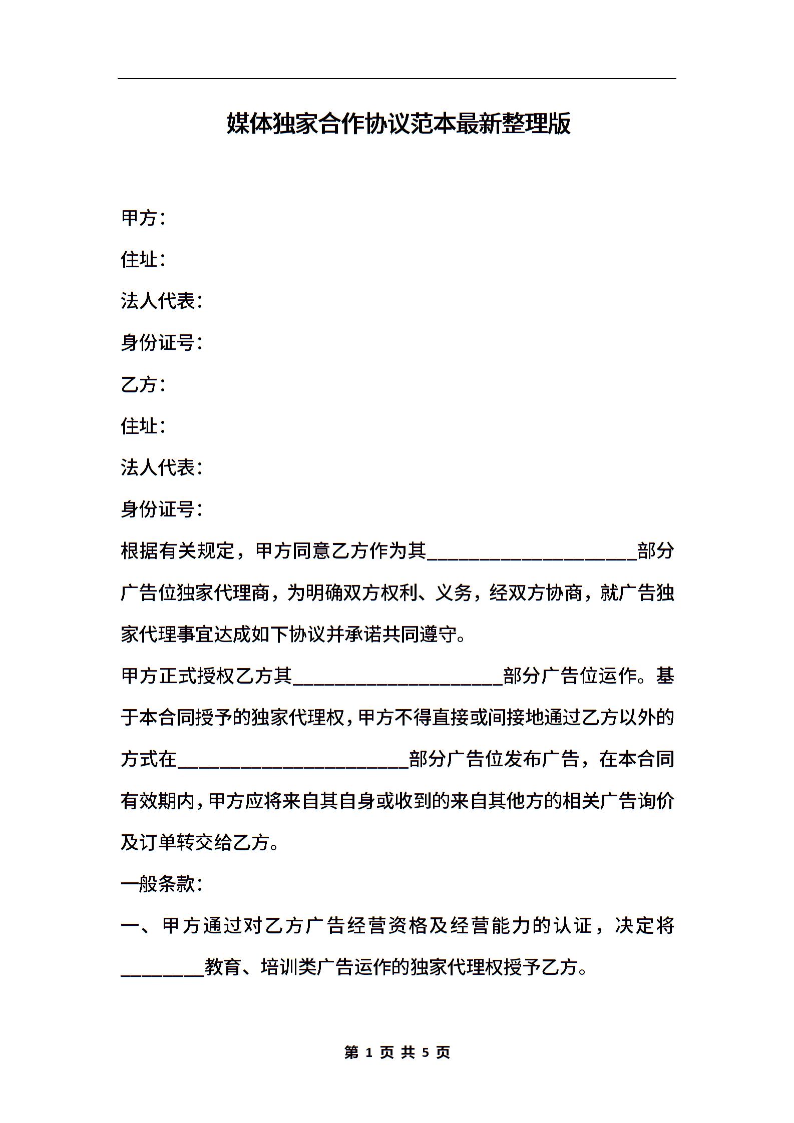 媒体独家合作协议范本最新整理版
