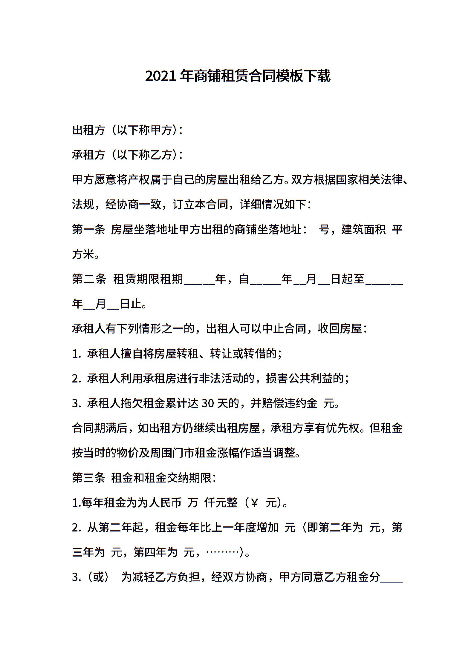 2021年商铺租赁合同模板下载 (2)