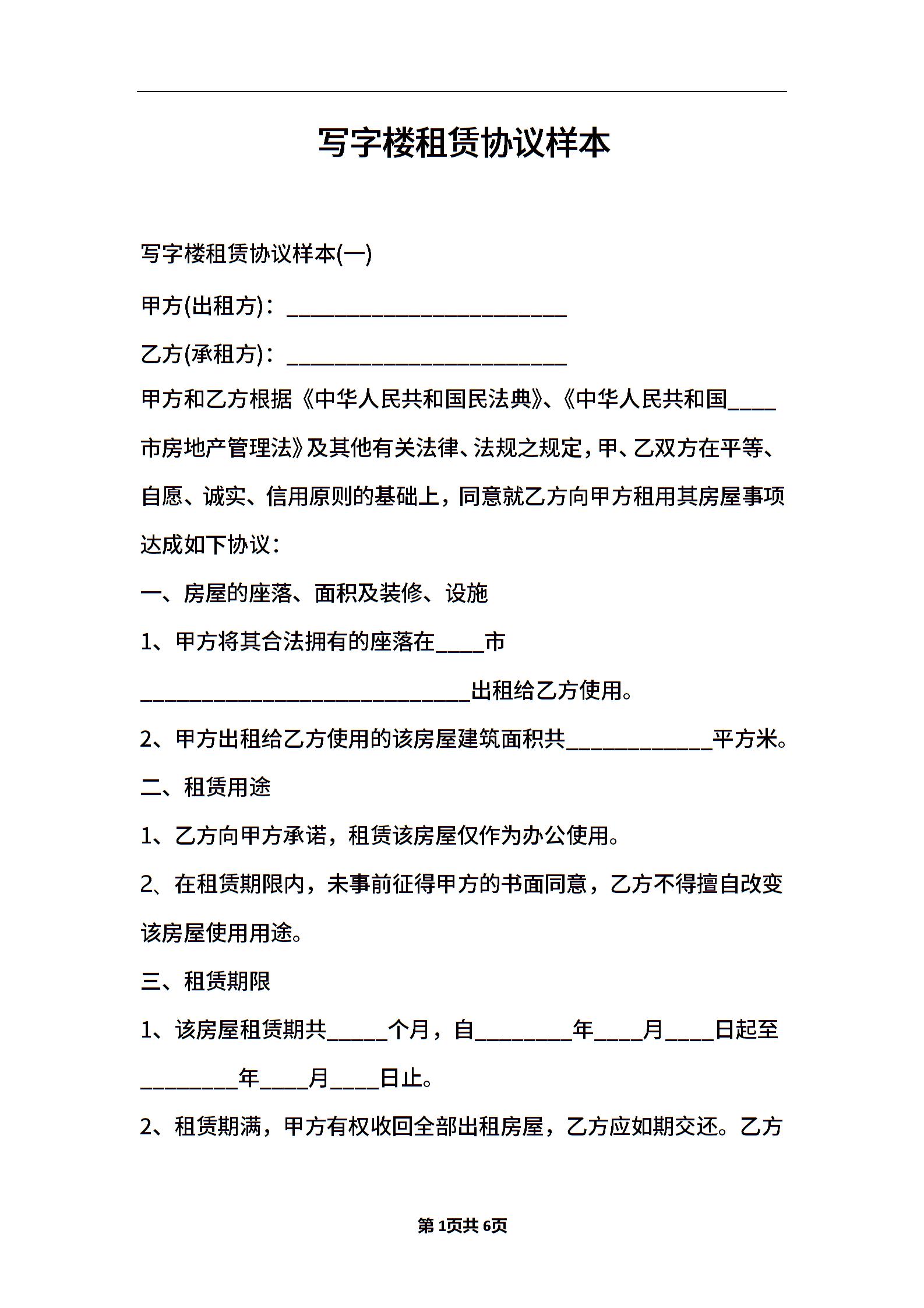 写字楼租赁协议样本