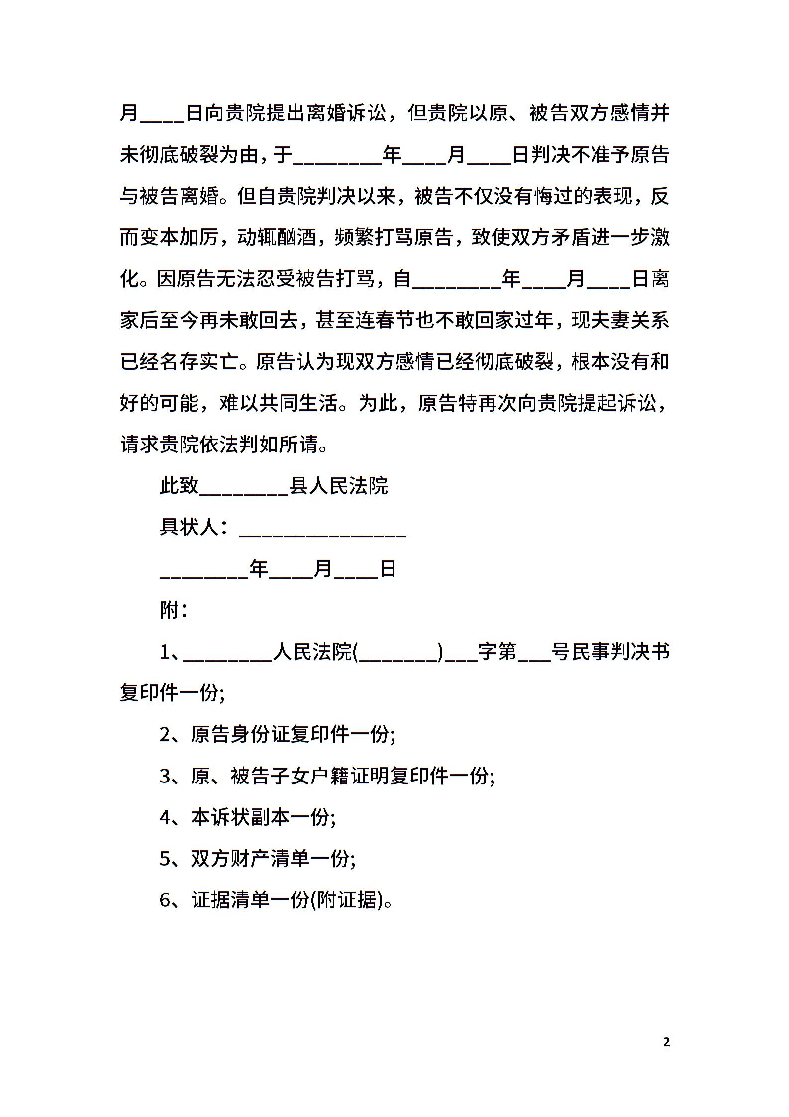 第二次离婚起诉状样本