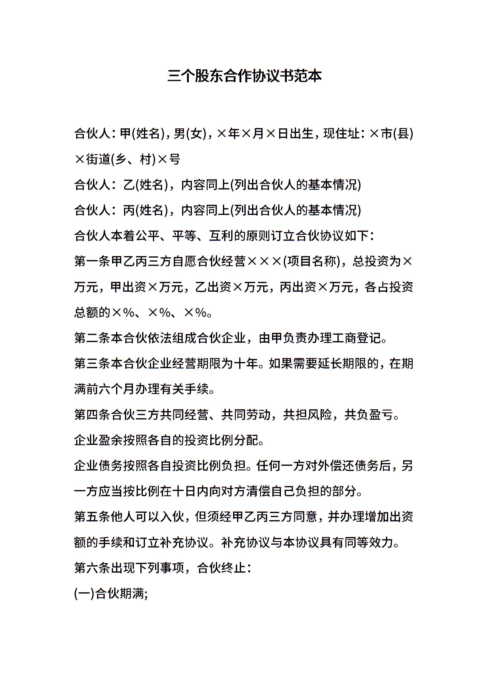 三个股东合作协议书范本