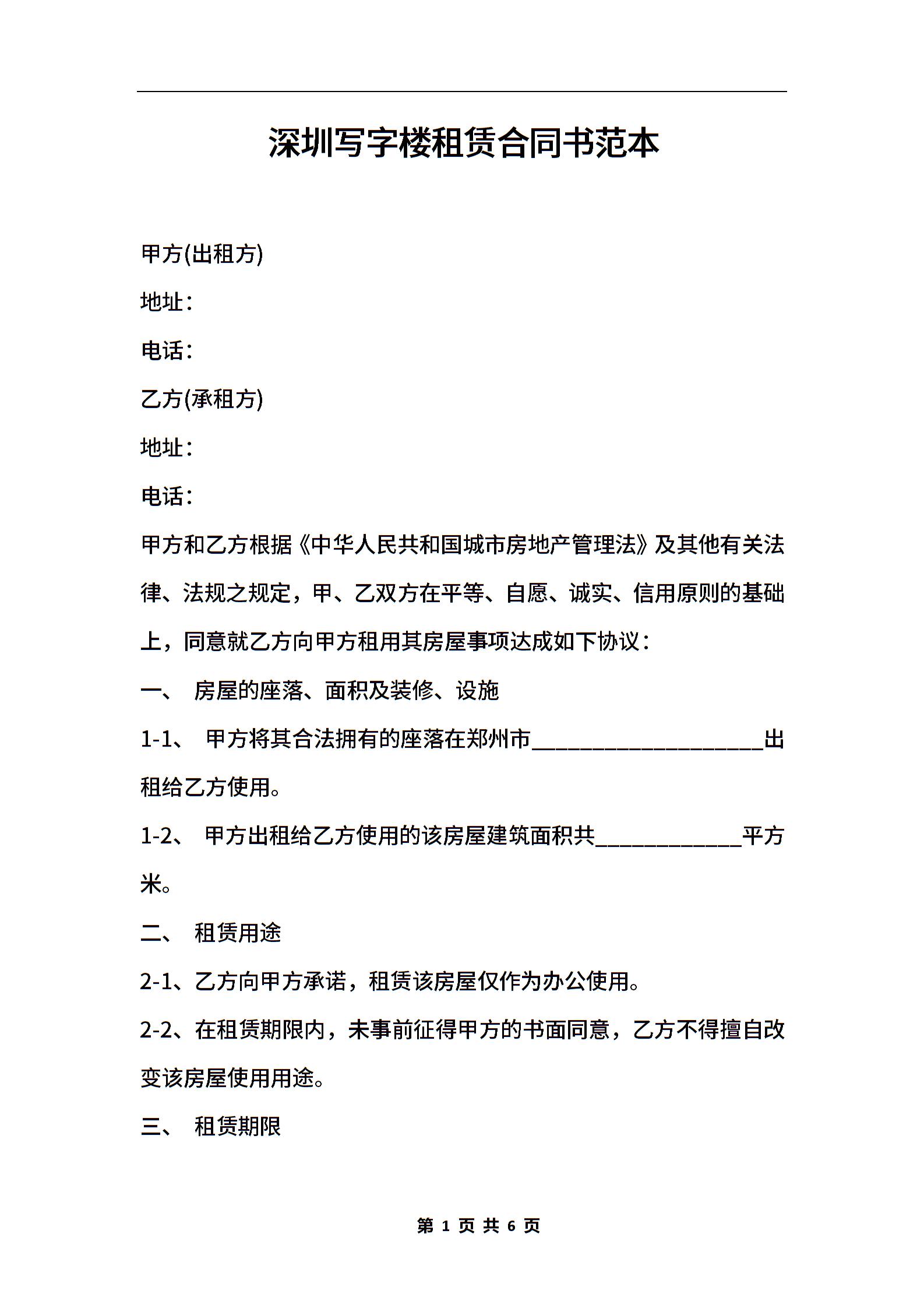 深圳写字楼租赁合同书范本
