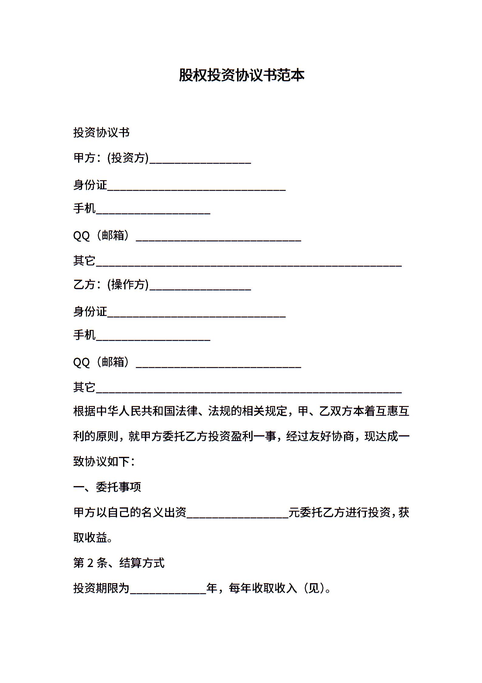 股权投资协议书范本