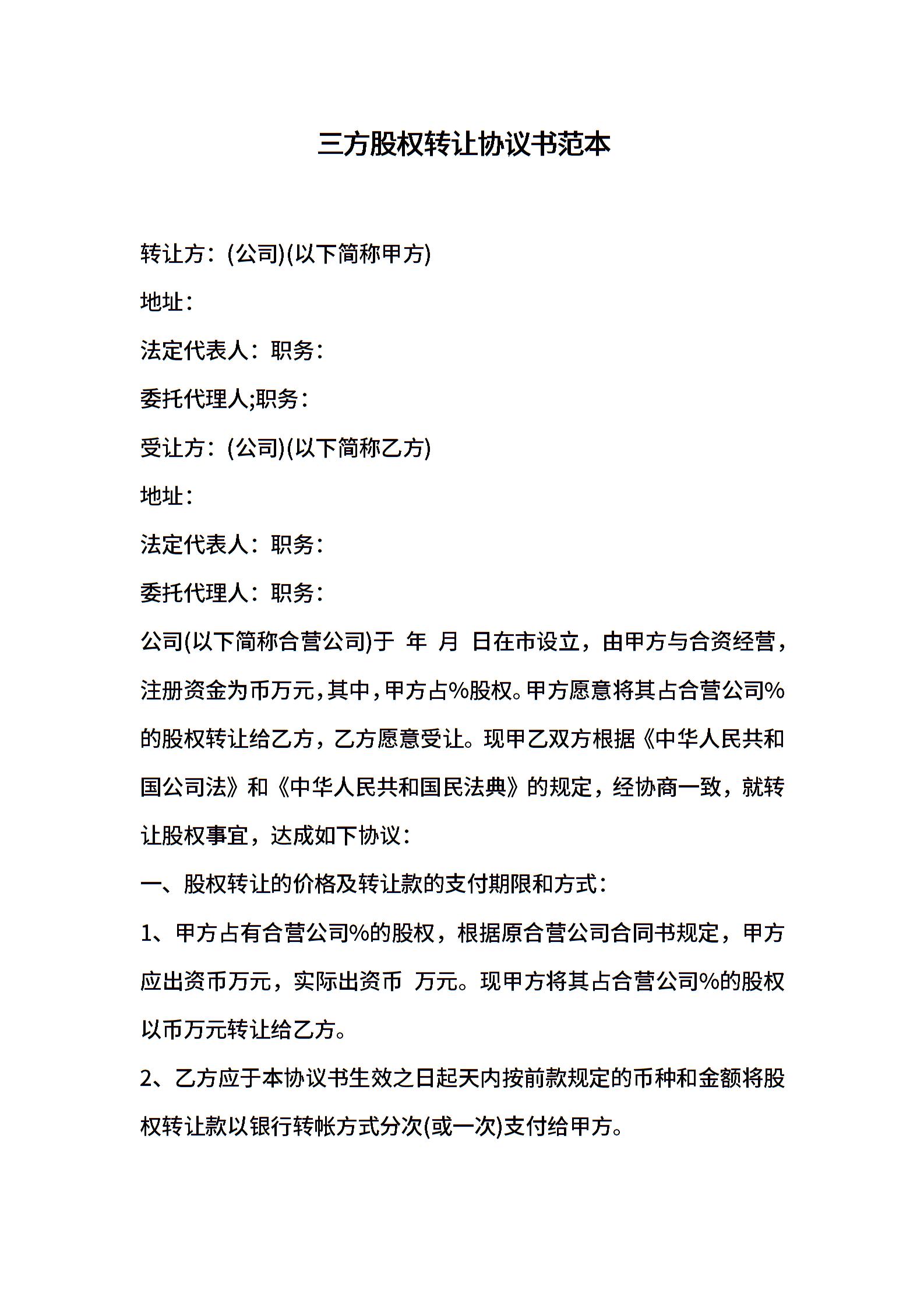 三方股权转让协议书范本