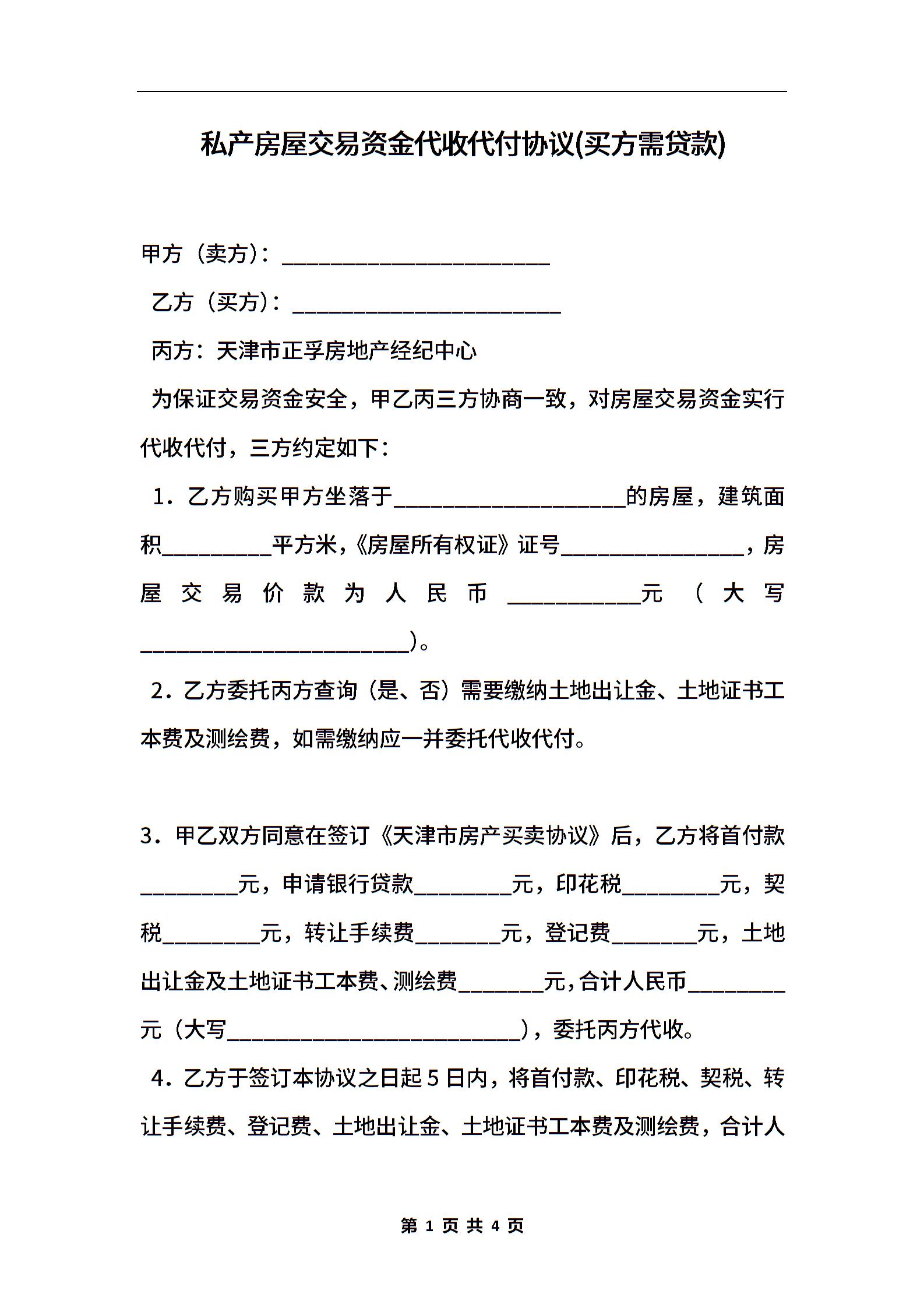 私产房屋交易资金代收代付协议(买方需贷款)