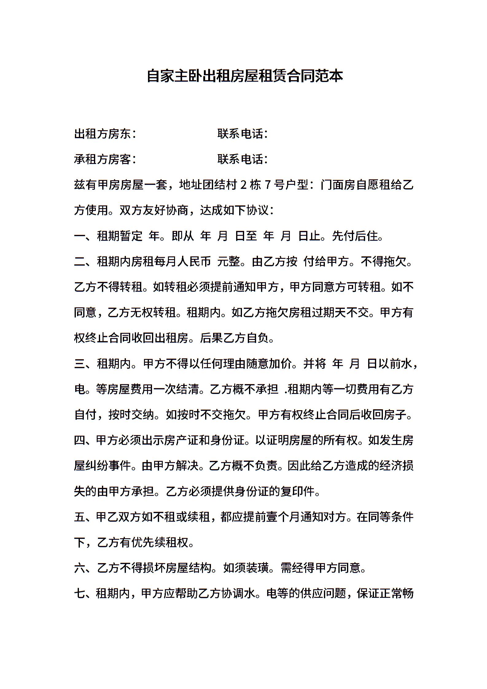 自家主卧出租房屋租赁合同范本