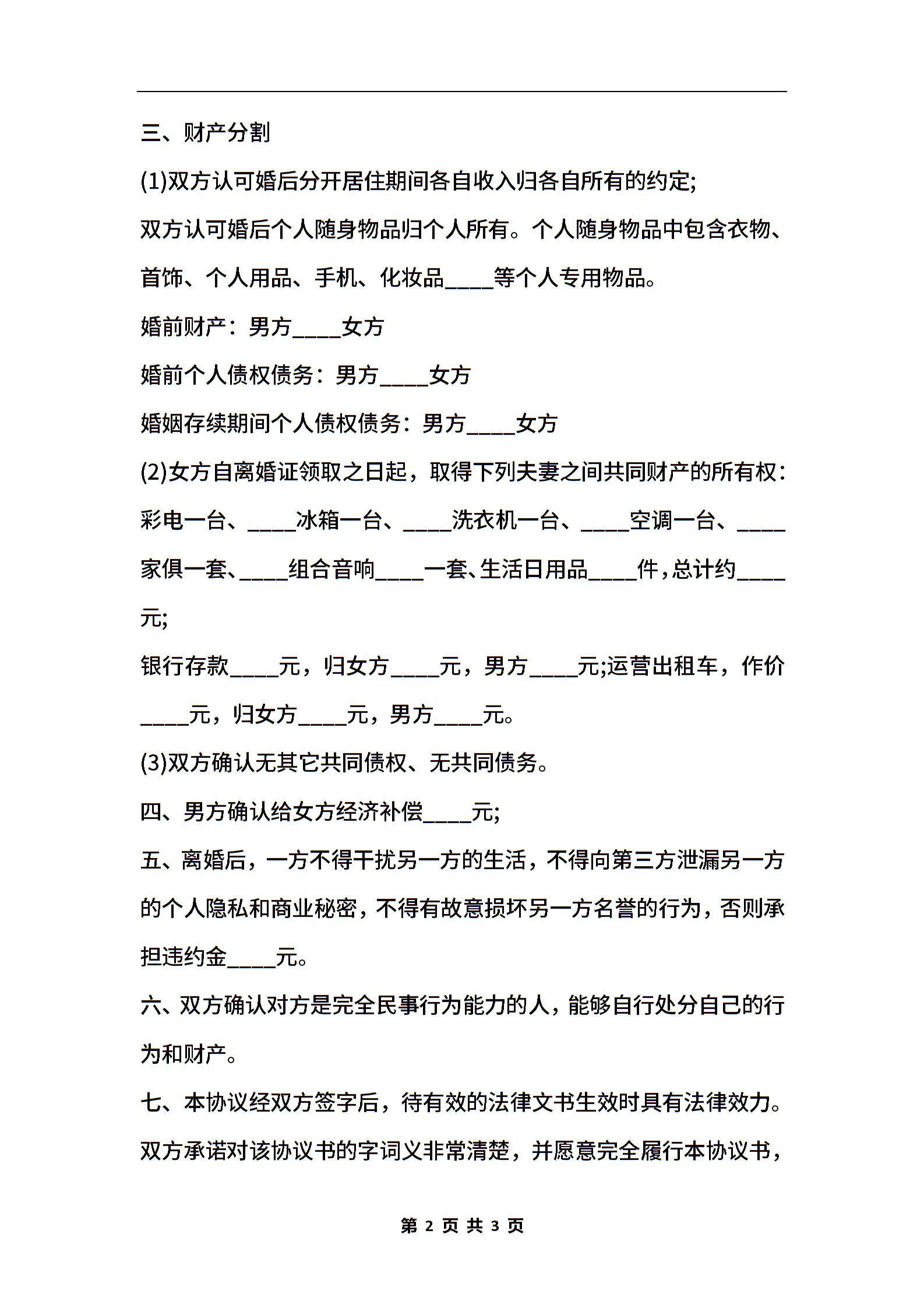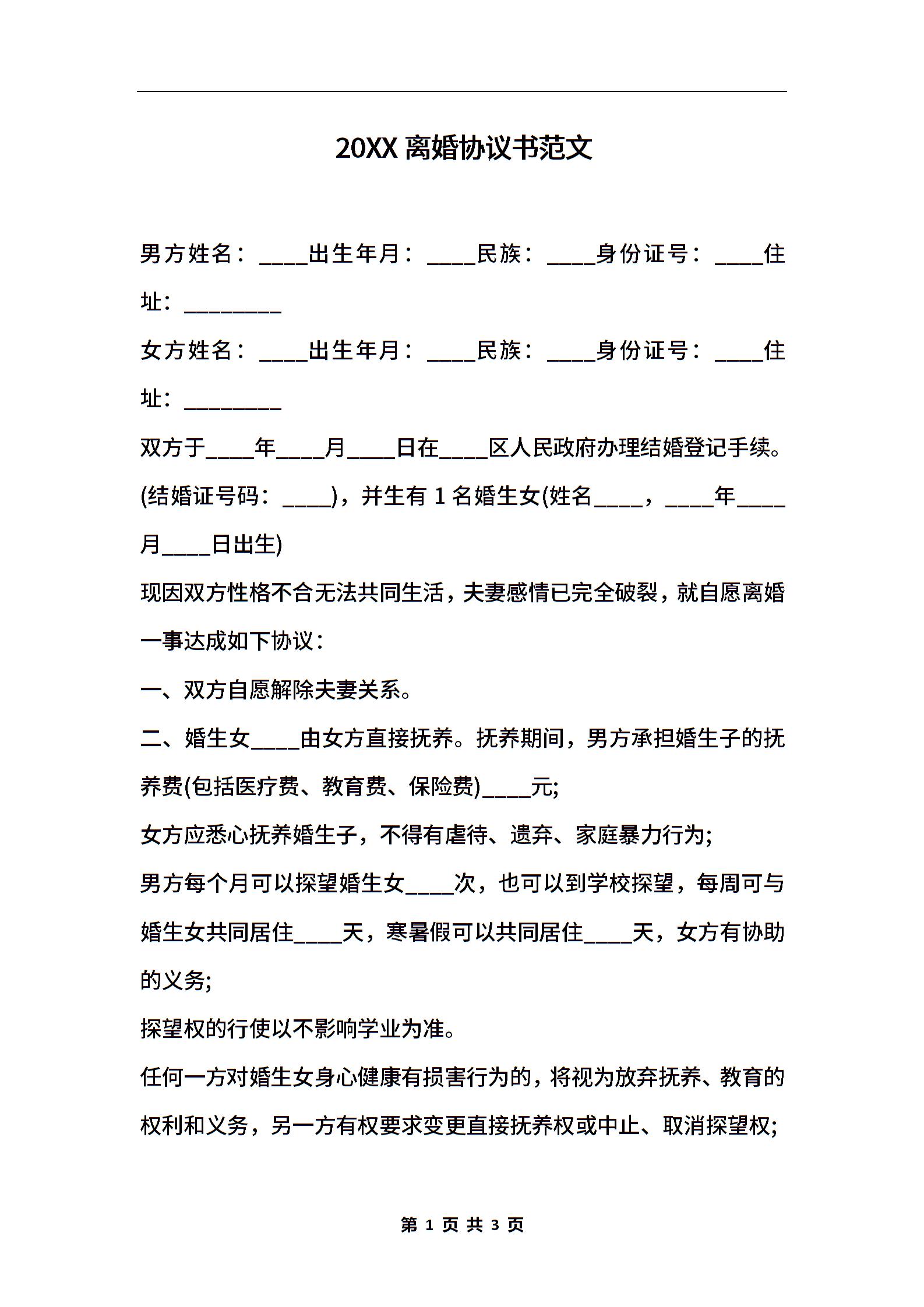 2020离婚协议书范文