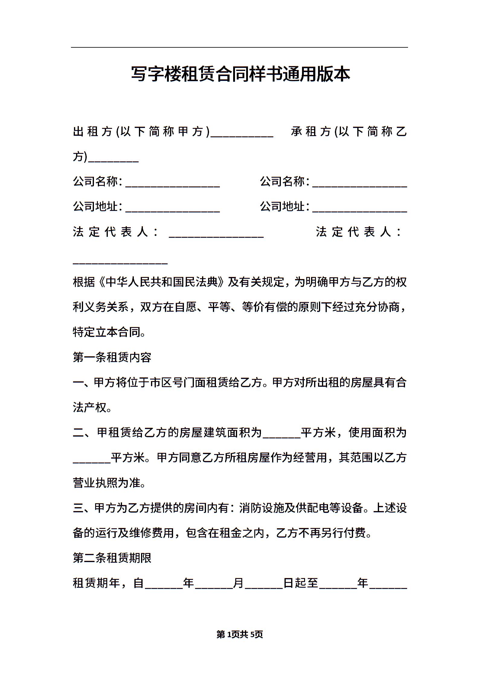 写字楼租赁合同样书通用版本