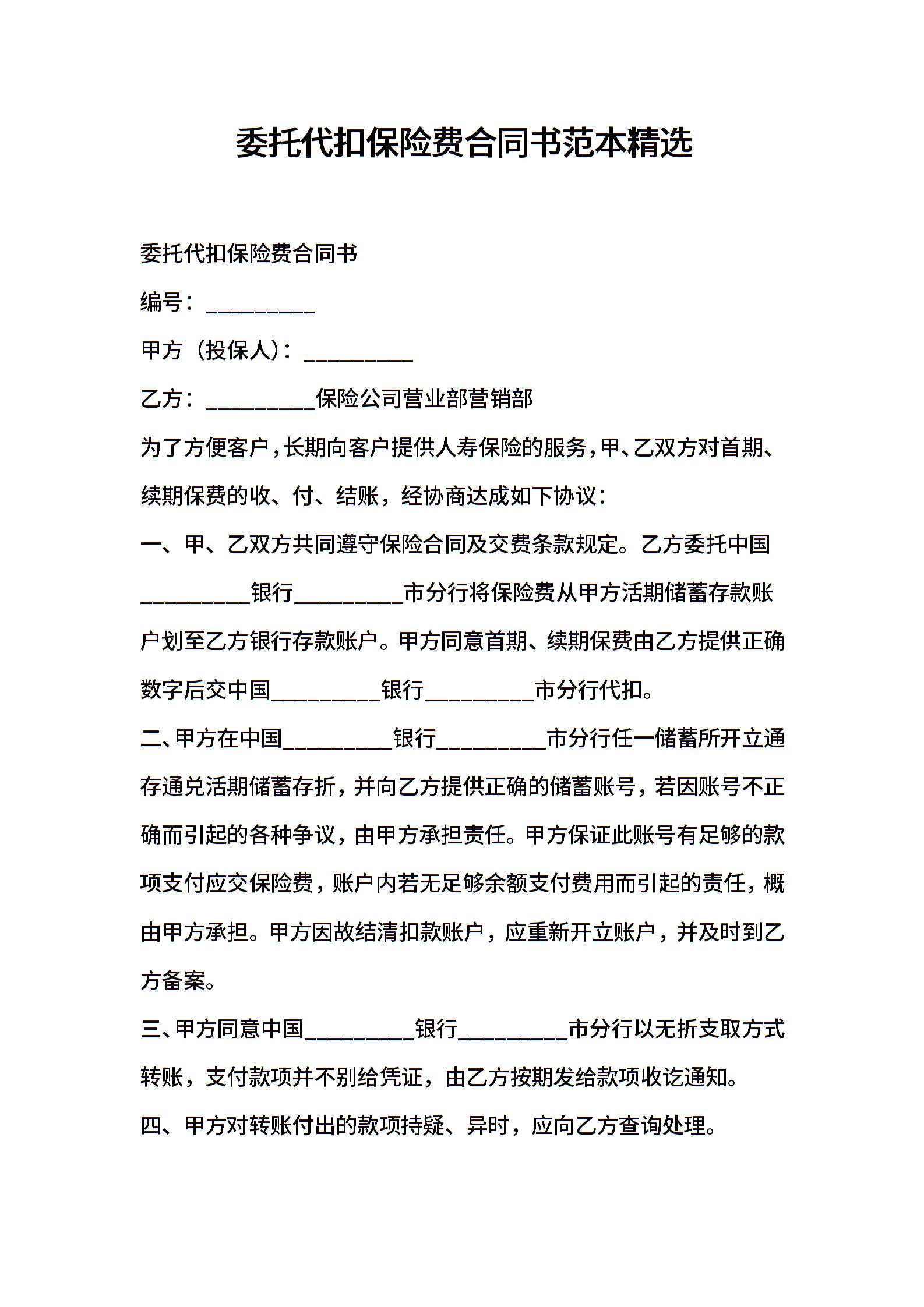 委托代扣保险费合同书范本精选
