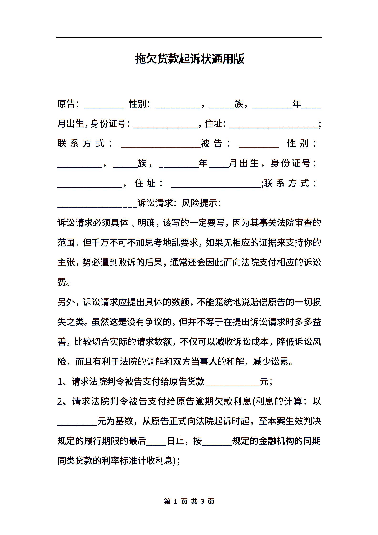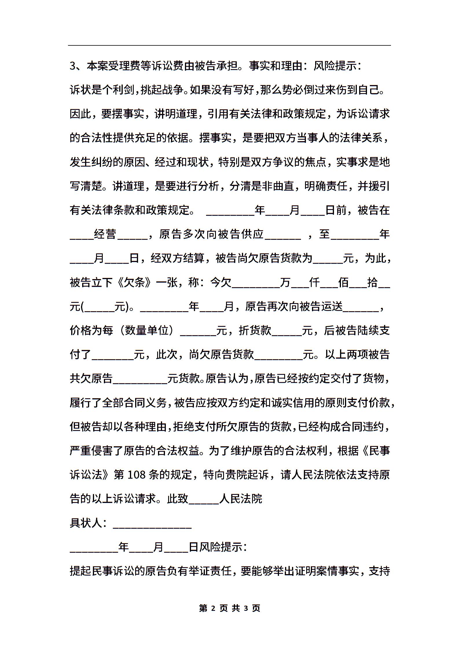 拖欠货款起诉状通用版