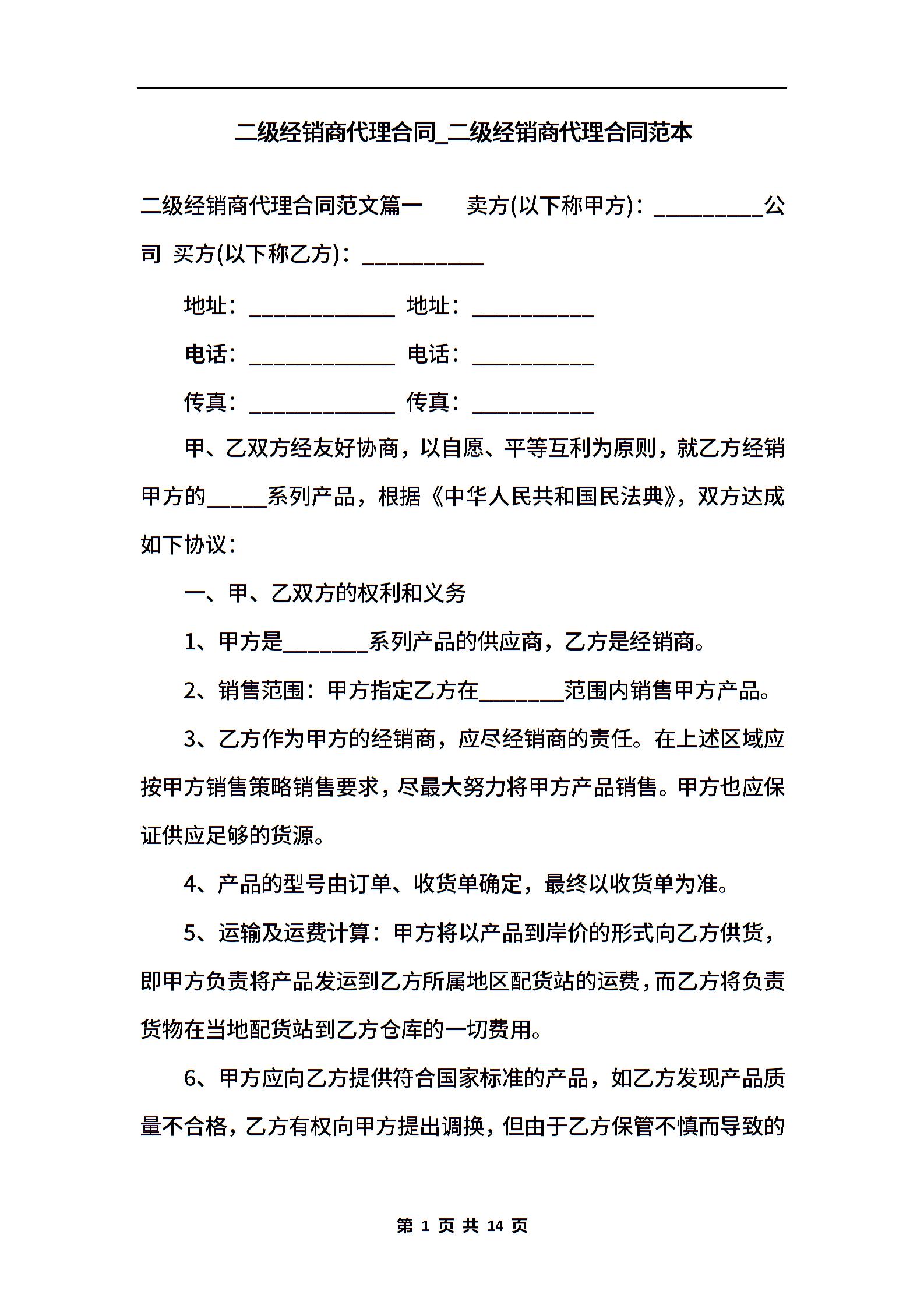 二级经销商代理合同_二级经销商代理合同范本.docx