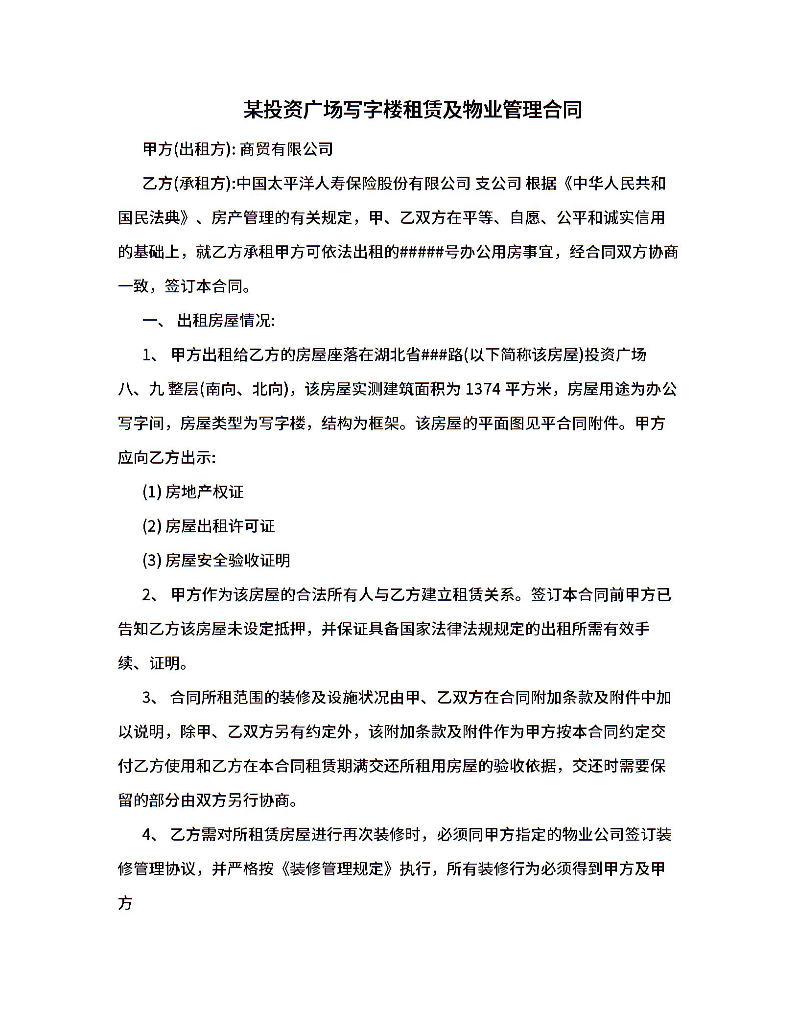 某投资广场写字楼租赁及物业管理合同.doc